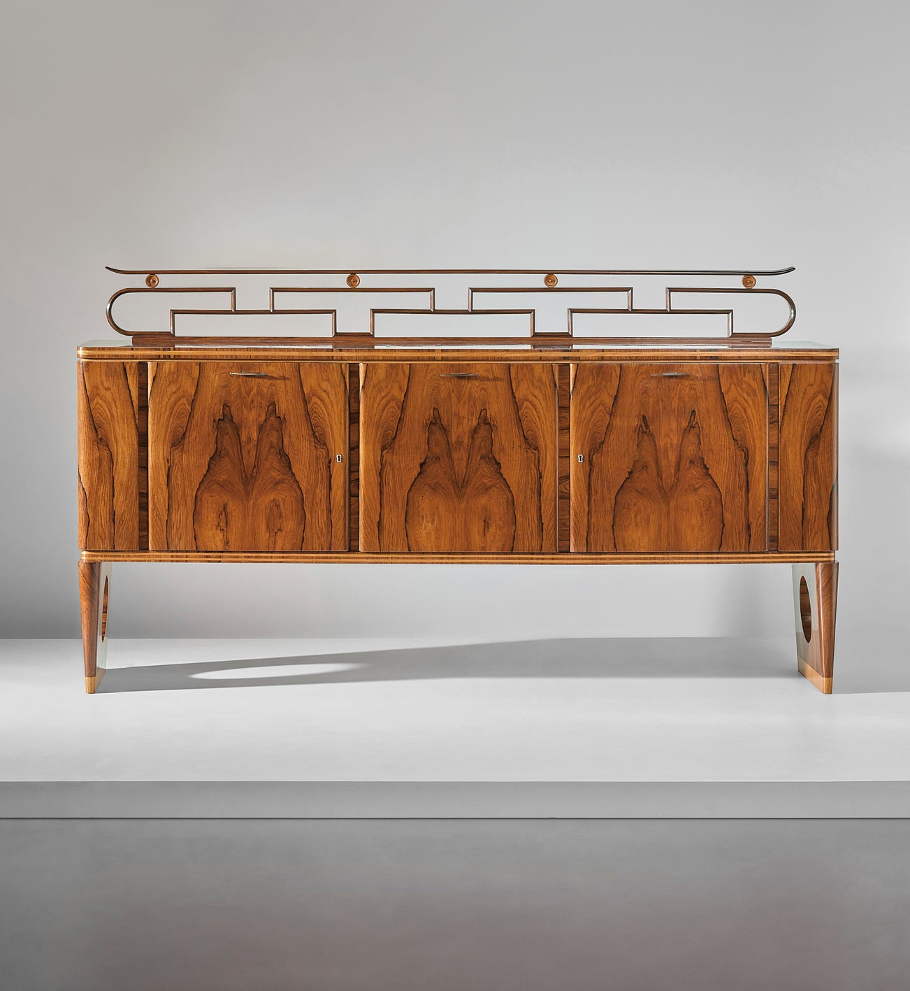Having trained in the studio of Gio Ponti and Emilio Lancia, in 1928 Paolo Buffa opened his own practice in Milan with Antonio Cassi Ramelli. Towards the end of the 1920s, the architect had started to incorporate oriental stylistic elements to his work, pairing them with the formal and sophisticated features of Neoclassicism, which was the preferred style favoured by a group of architects from Lombardy including Ponti, Lancia and Tomaso Buzzi. The present sideboard exemplifies the combination of the two styles. In the present work, Buffa enriches his Classicist repertoire, emphasising uniform and rigorous shapes with new exotic forms, as evidenced by the brass decorative unit placed at the top of the sideboard, recalling the Chinese labyrinths. This sideboard features additional recurring characteristics in Buffa’s work, notably the use of precious materials and the architect's ability to create works with balanced composition and great elegance, enabled by the experienced craftsmen he worked with, including Serafino Arrighi. Similar characteristics can be found in another sideboard designed by Buffa and published in Domus in 1930 (Domus, no. 31, July 1930, p. 1331), which features curved sides imitating the roofs of the pagodas.