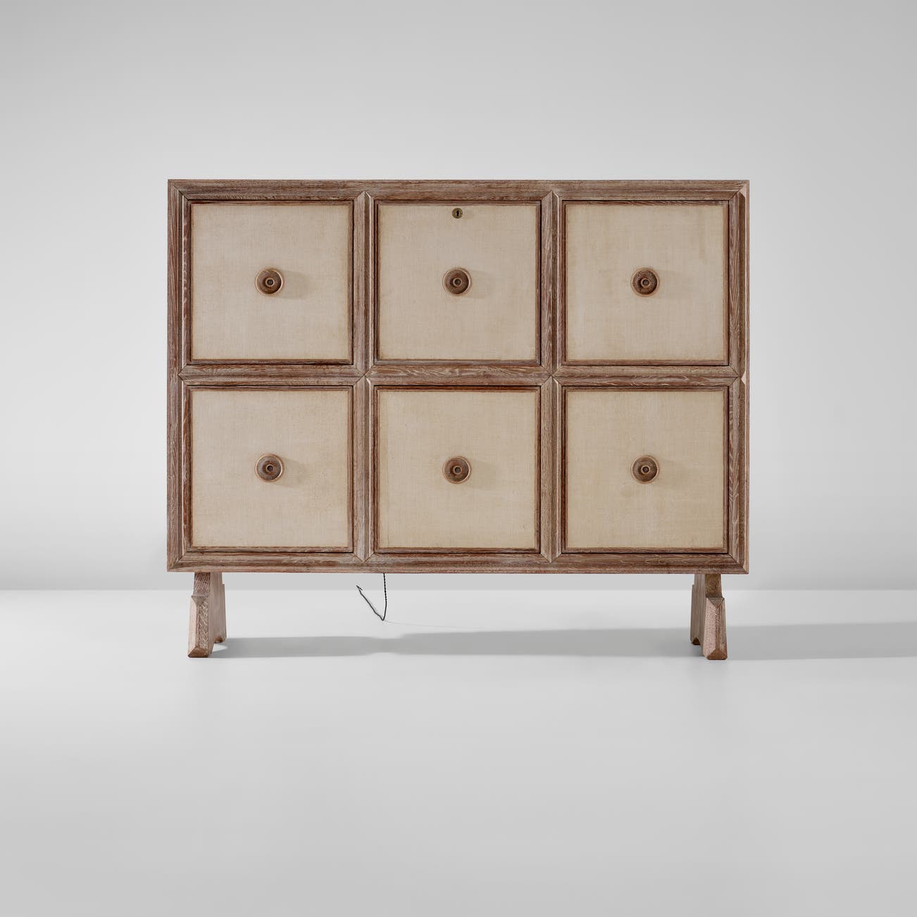 Limed oak, limed oak-veneered wood, fabric, mirrored glass, coloured glass, brass.