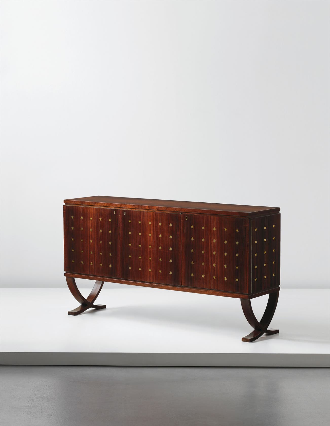 Rosewood-veneered wood, brass inlays, wood, frosted glass, clear glass.