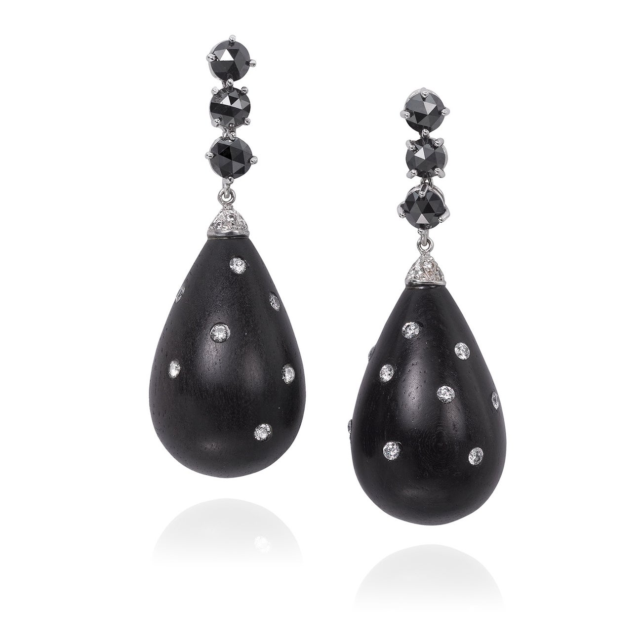A Pair of Black Diamond, Diamond, Wood, and White Gold Earrings