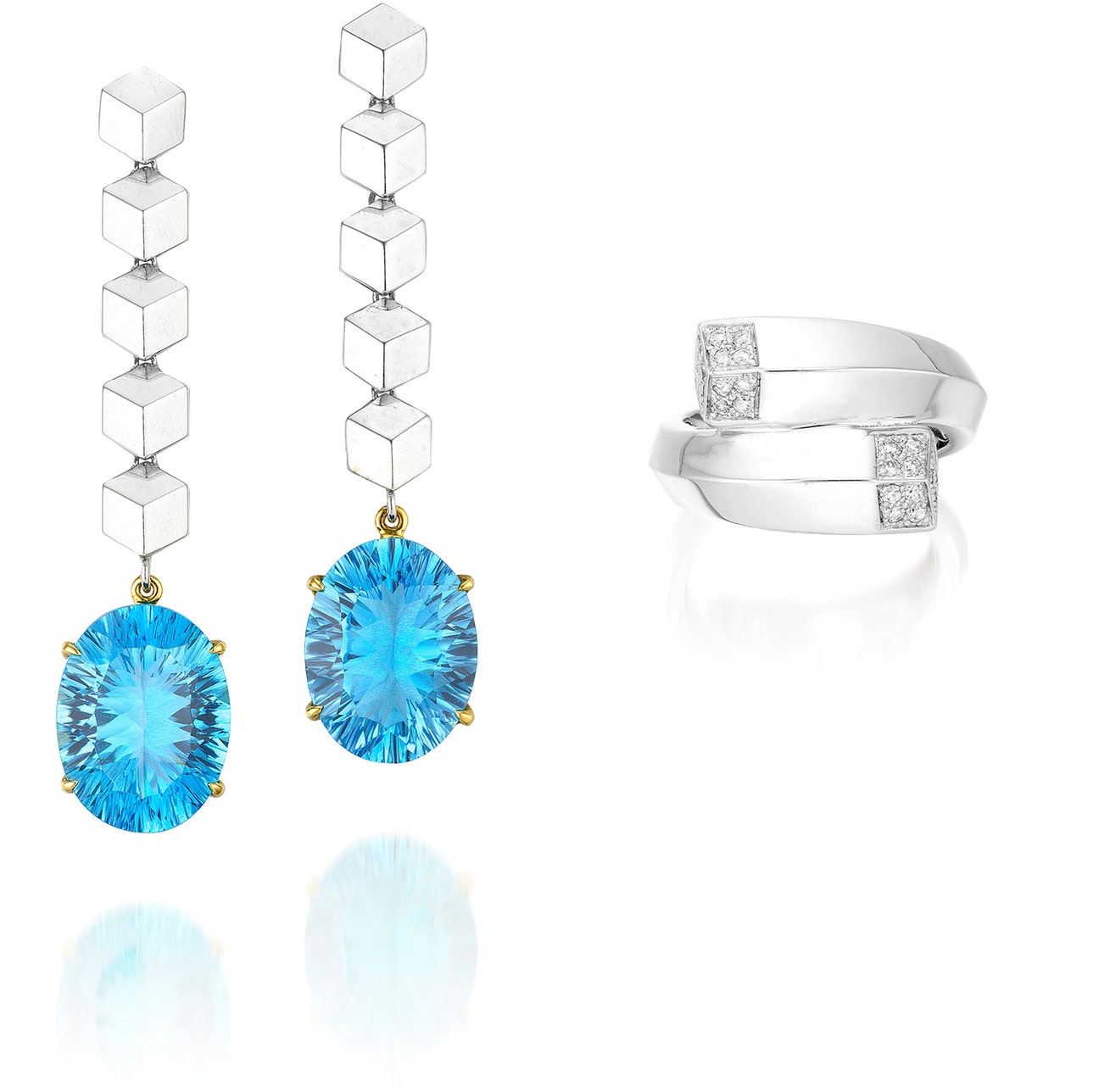 Comprising: a pair of earrings, each set with an oval topaz, suspending from a line of white gold cubes, mounted in white gold and yellow gold, post and butterfly fittings, pendants detachable, signed Paolo Costagli, length approixmately 60 mm; and a ring of crossover design, each terminal pavé-set with brilliant-cut diamonds, mounted in white gold, signed Paolo Costagli, size 7¼.