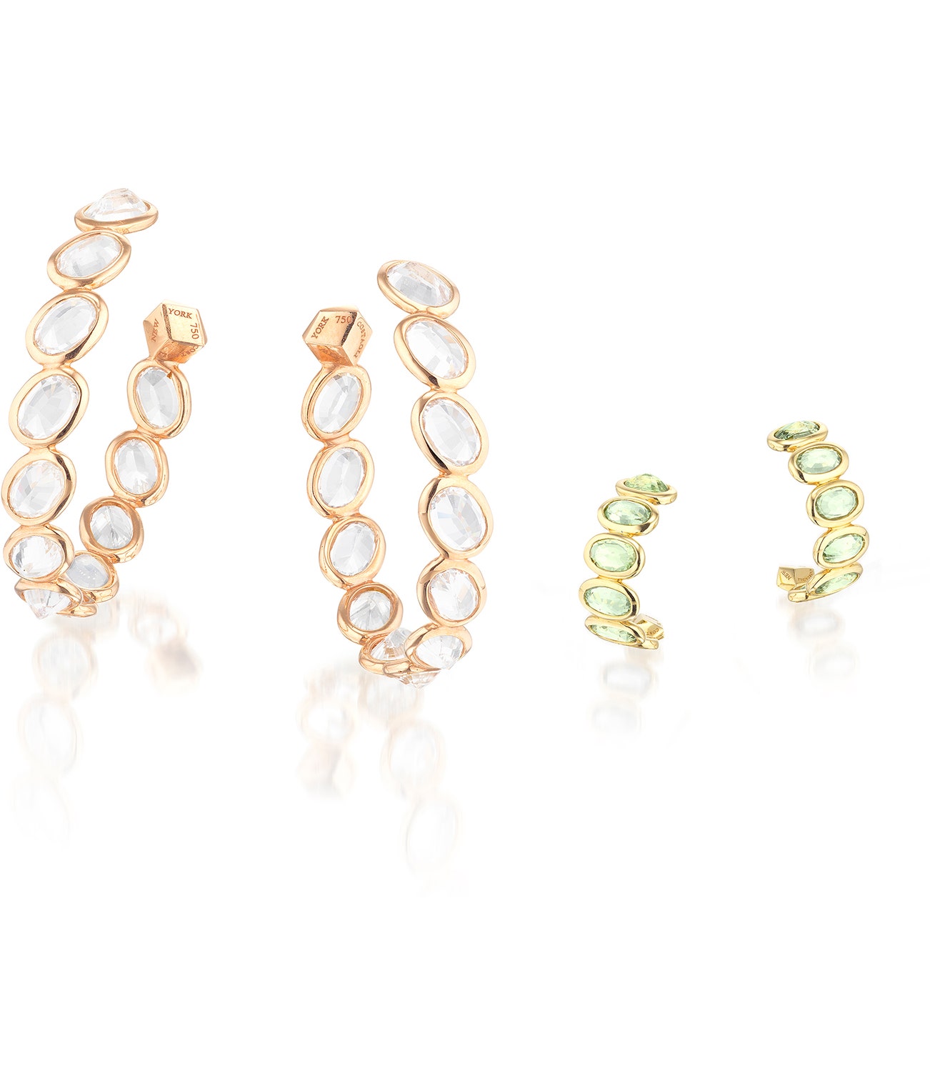 Comprising: two pairs of half hoop earrings of similar design, the first pair invertly-set with a line of oval white sapphires; the second pair invertly-set with a line of oval sapphires of green tint, mounted in pink and yellow gold respectively, signed Paolo Costagli, post and butterfly fittings, length approximately 38 mm and 18 mm respectively.