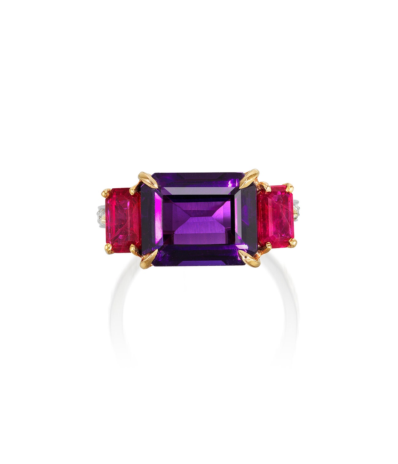 Set with a step-cut amethyst between two step-cut rubies, shoulders enhanced by brilliant-cut diamonds, mounted in gold and white gold, signed Paolo Costagli, size 6.