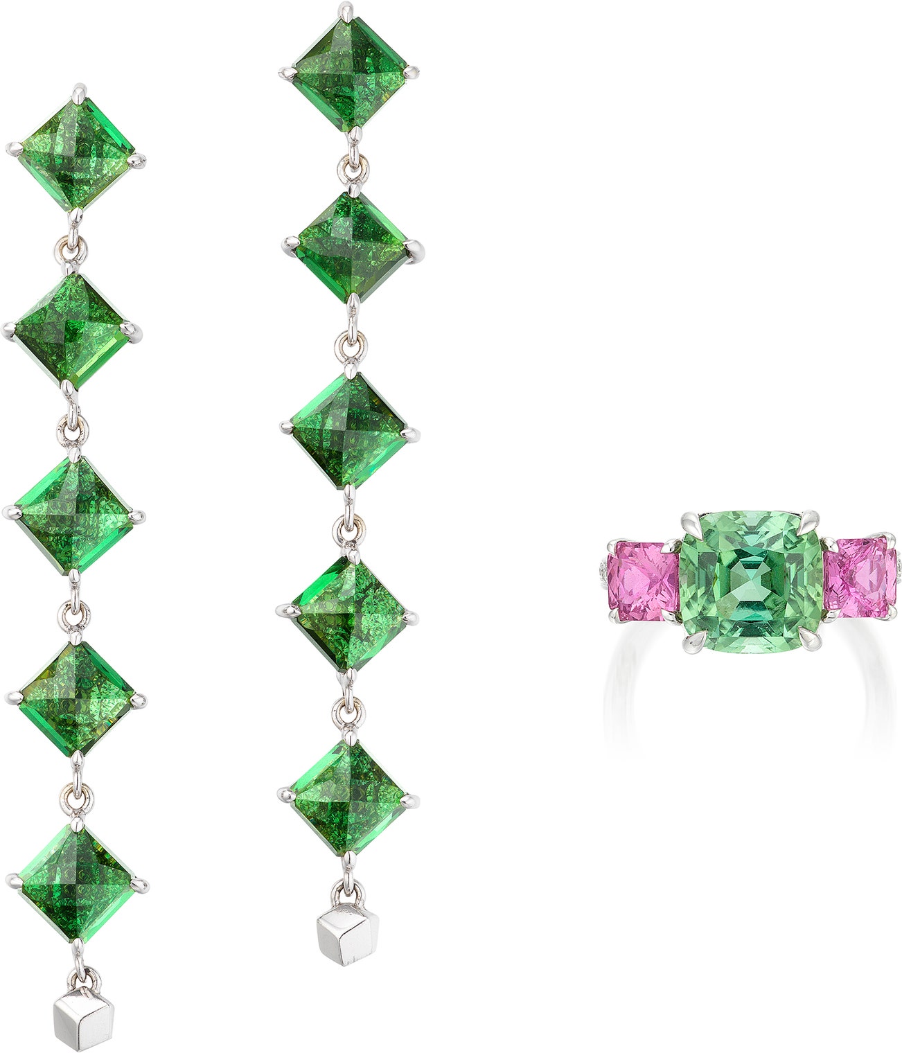 Comprising: a pair of earrings, each designed as an articulated line of square-shaped green tourmalines, mounted in white gold, signed Paolo Costagli, post and butterfly fittings, length approximately 60 mm; and a ring set with a cushion-shaped green tourmaline, between two square-shaped pink tourmalines, gallery and shoulders enhanced by brilliant-cut diamonds, mounted in white gold, signed Paolo Costagli, size 5¾.