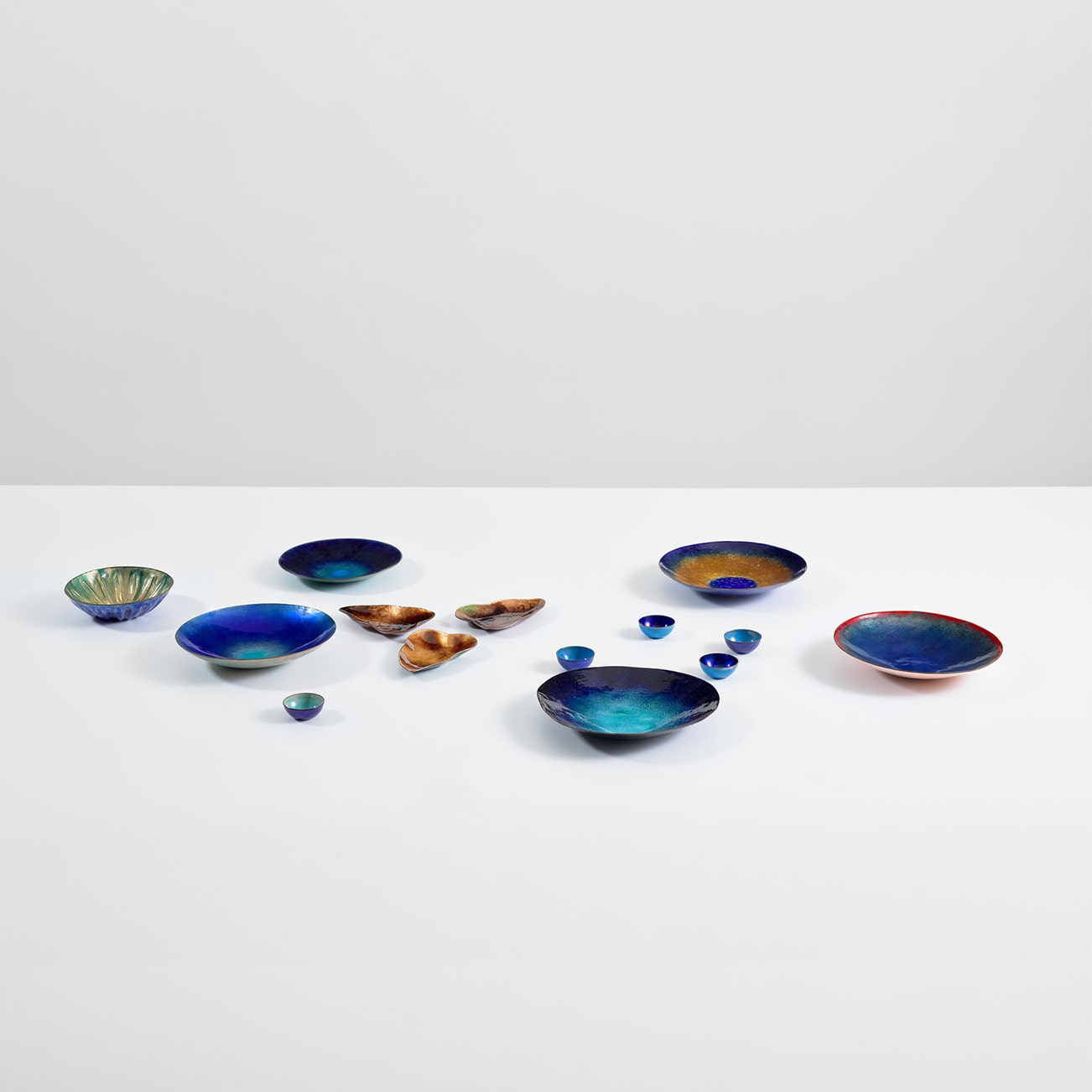 Produced by Smalti de Poli, Padua, Italy. Comprising 5 dishes, 5 small bowls, 3 leaves and 1 bowl. Underside of each small dish, each leaf and two dark blue dishes incised De Poli. Underside of red and blue dish and orange and blue dish incised De Poli/1968. Underside of dark blue dish incised De Poli/1964. Underside of bowl incised De Poli, partially obscured by paper label. Each dish and bowl with paper label printed SMALTI DE POLI/PADOVA-Via S. Pietro, 43. Underside of each leaf with paper label printed SMALTI DE POLI/per ARCADIA s.r.l./CATANIA.