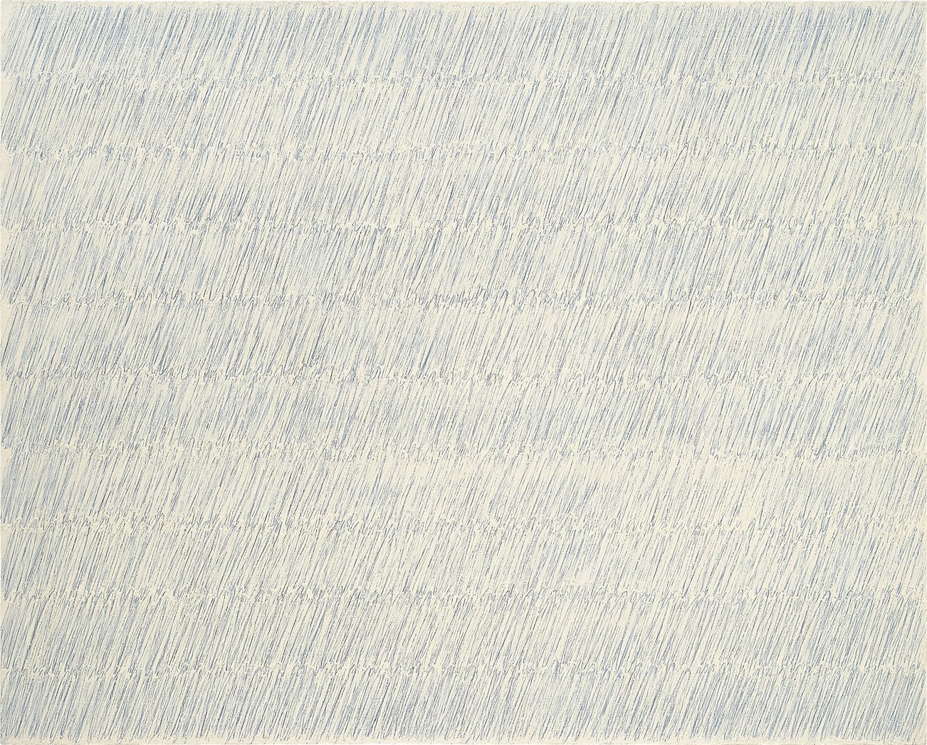 Conflating the ethos of traditional Korean culture with the formal language of Minimalism, Écriture No. 96-75 represents a primary example from the mid-1970s underlining a crucial turning point in the esteemed career of pioneering Korean avant-garde artist, Park Seo-Bo. Thickly-drawn horizontal bands of dense oscillating lines rendered in pencil on an ivory background reduce the element of subjectivity within the present lot to the most miniscule point. Park repeats this process of painting and inscribing with pencil only until he is satisfied. Epitomized by the purely physical act of drawing, Écriture No. 96-75 references the disciplined practice of calligraphy yet showcases the ceaseless movement not as a means to represent a certain object or image, but rather as a strict record of the work’s conception. As a principal example of Park’s lifelong commitment to the impossible aim of deconstructing the “ego” and proclaiming non-purposefulness to attain complete liberation of the self, Écriture No. 96-75 offers a space for spiritual consolation and exultation. (Kim Bok-Young, “Korean monotone flat painting in 1970s-80s,” Age of Philosophy and Aesthetics, National Museum of Contemporary Art, 2002, pp. 42-44, reprinted in Pak So-bo and Taegu Misulgwan, Park Seo Bo, Daegu Art Museum, 2012.) Emitting a serene collected power with its subtle indefinable depth, the present lot showcases Park Seo-Bo’s distinctive practice within the greater context of the high-profile Dansaekhwa movement.