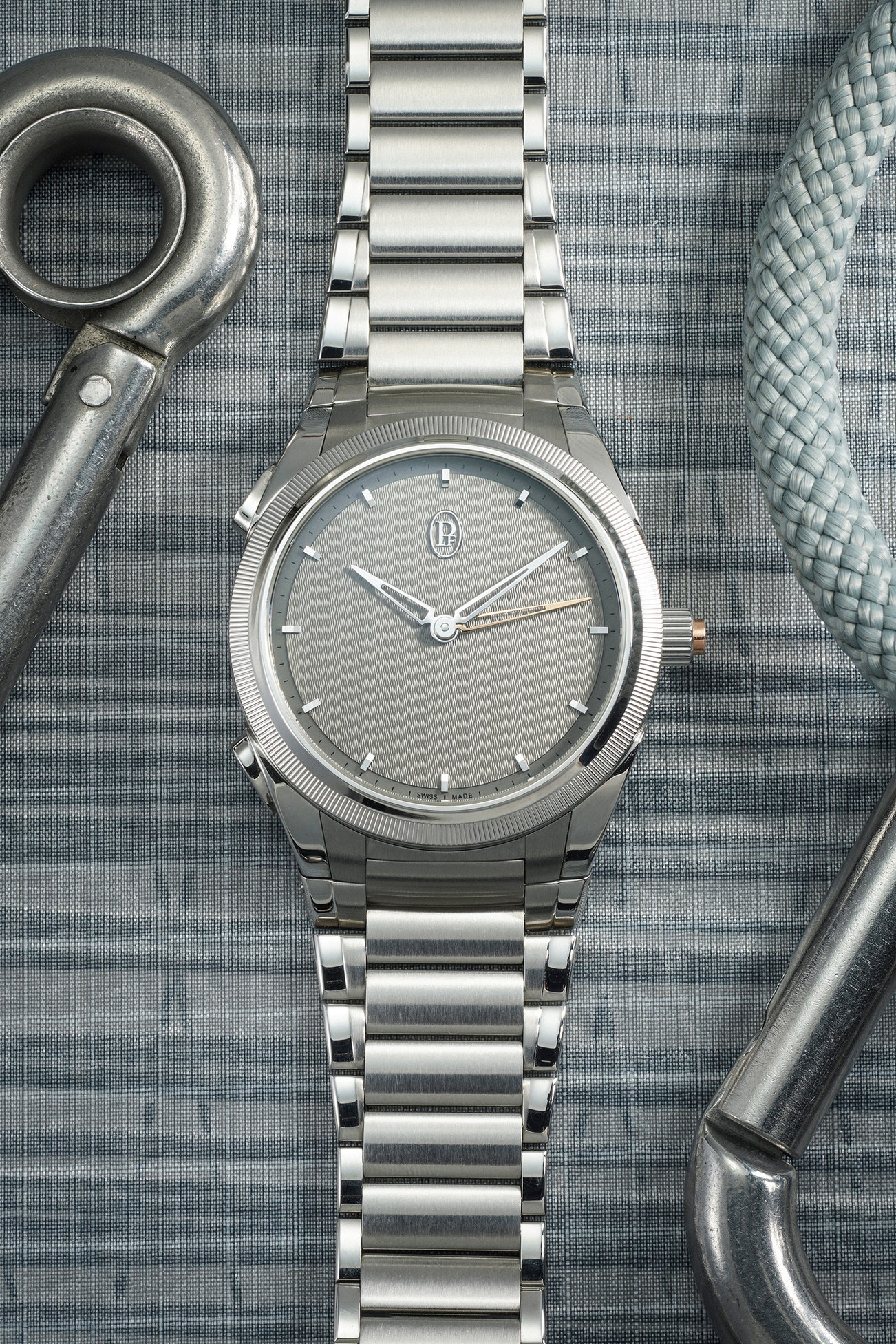 A fine and attractive stainless steel wristwatch with sand grey grain d’orge guilloché dial, minute splitting hand, bracelet, certificate of origin and presentation box