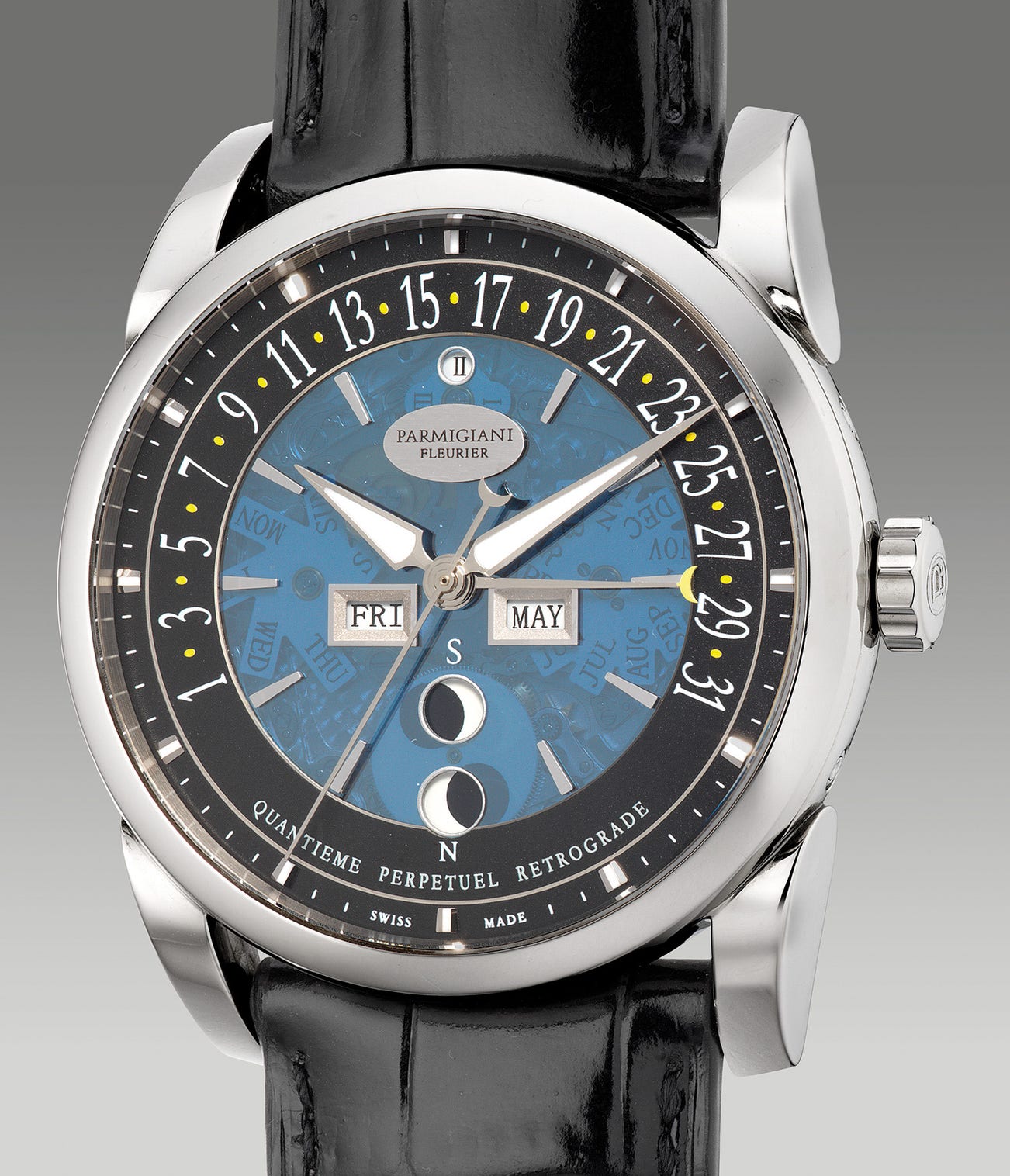 Released in 2016, the Parmigiani Tonda Centum Perpetual Openworked is essentially the same as the regular model, however with a newly implemented tinted greyish blue transparent dial. Although many may argue that the present timepiece is not entirely “openworked”, the transparent dial essentially allows the wearer to appreciate the intricate mechanism behind the perpetual calendar timepiece. Encased in its traditional round-shaped case with streamlined teardrop lugs, the present timepiece definitely reflects the essence of Parmigiani. Although the tinted transparent greyish blue dial may reveal parts of the mechanism of the movement, the layout does not seem too clustered and maintains an excellent legibility of the indicators on the dial. A retrograde-style date indication is clearly positioned and indicated via an additional yellow crescent tipped hand, a leap year indication is presented in an aperture at 12 O’clock with two windows above the moon phases depict the day and month.