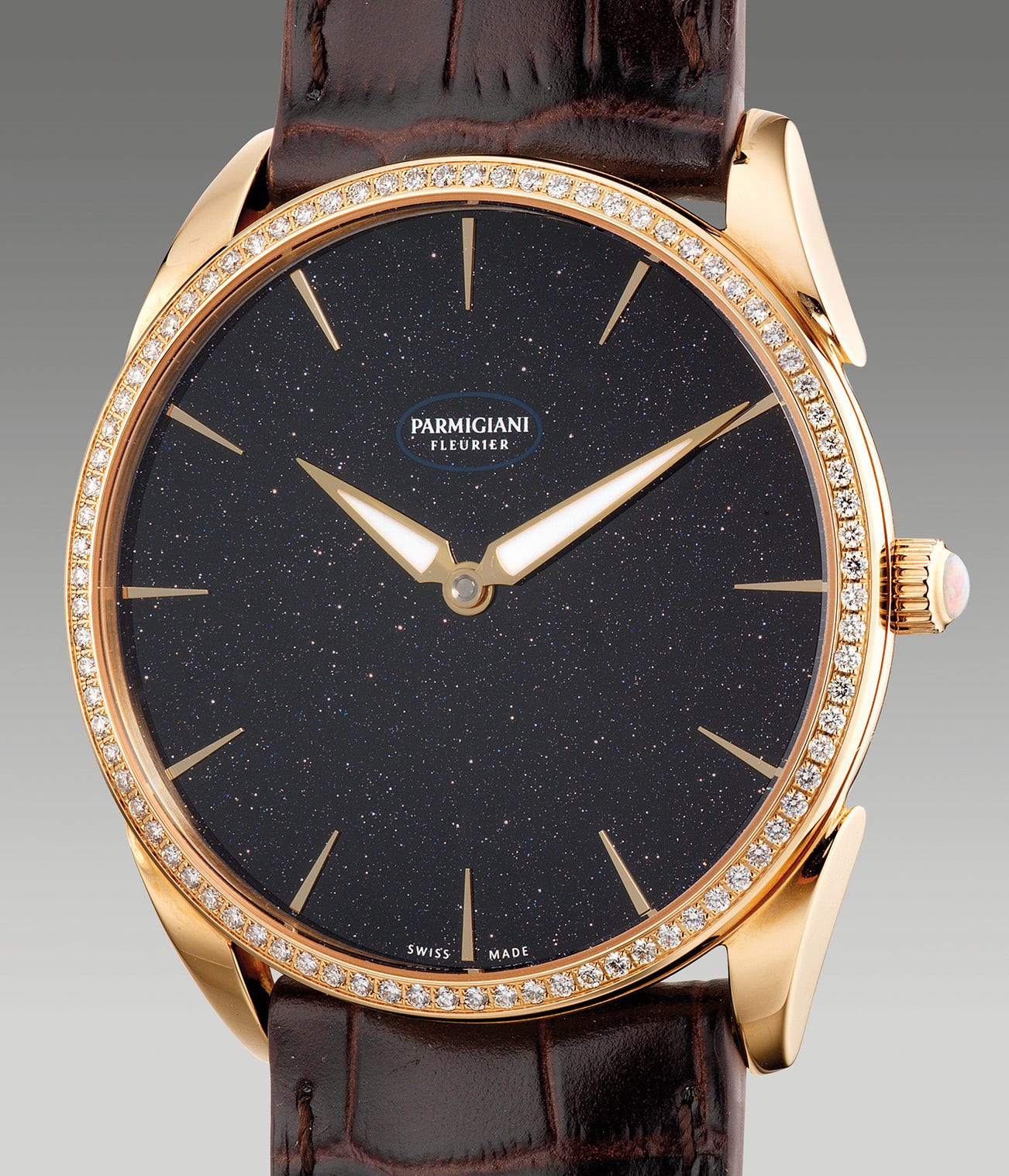 Introduced as a special edition in 2018, the Parmigiani Tonda 1950 Galaxy offers a shimmering alternative of the Tonda model. Inspired from the uninterrupted star-filled night sky of Val-de-Travers, home of Parmigiani, the dial is composed of aventurine with a dark blue appearance glistened with small copper inclusions mimicking the beautiful stars at night. Encased in 18K pink gold with 84 brilliantly cut top Wesselton-colored diamonds on the bezel, the contrast is simply mesmerizing.