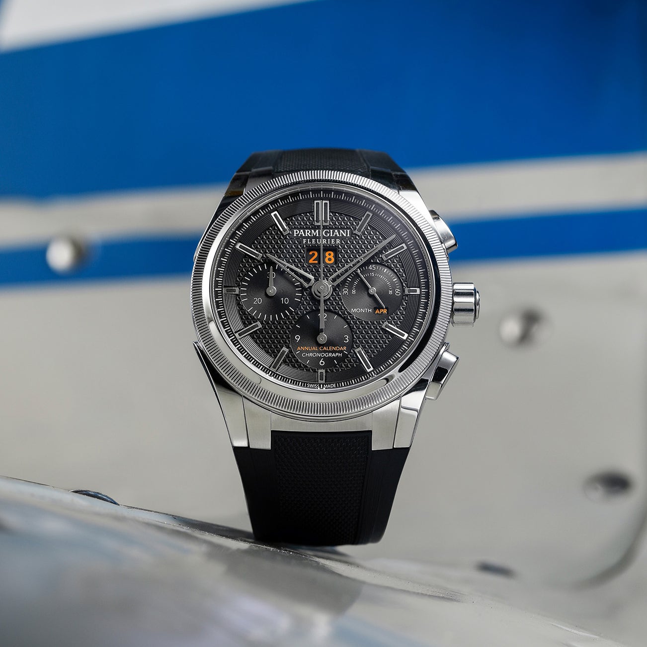 - The automatic caliber PF043 features an annual calendar (with date and month) and chronograph functions. At 12 o' clock the big date aperture is elegantly positioned just above the two subdial for the small seconds and chronograph function. The timepiece is water resistant to 100m and has a 45-hour power reserve.