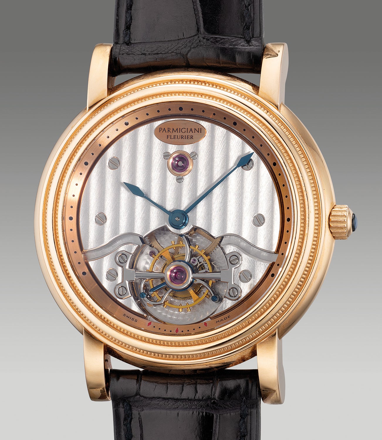 A distinguished timepiece representation of the quintessence of refined watchmaking, the Toric Tourbillon cased in 18K pink gold exhibits strong DNA from the very first case designed by Michel Parmigiani when he founded his eponymous brand. Featuring a contemporary case design well-proportioned to fit the wrist, the present tourbillon with exposed screws and Côtes de Genève striped finishing gives the futuristic appearance to the watch. Furthermore the hands are finished in blue steel giving it a stunning contract across the dial. Aesthetically pleasuring, the present timepiece is preserved in excellent overall condition.