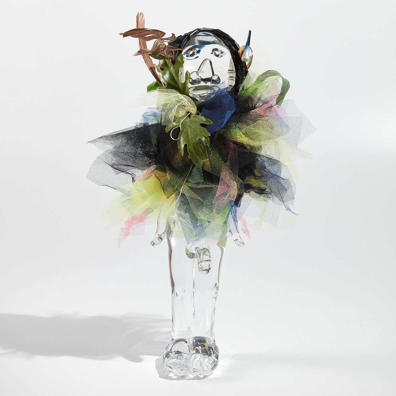 crystal figure, feathers, wood, string, toy shark tail, textiles and plastic mesh, foliage and cord assemblage