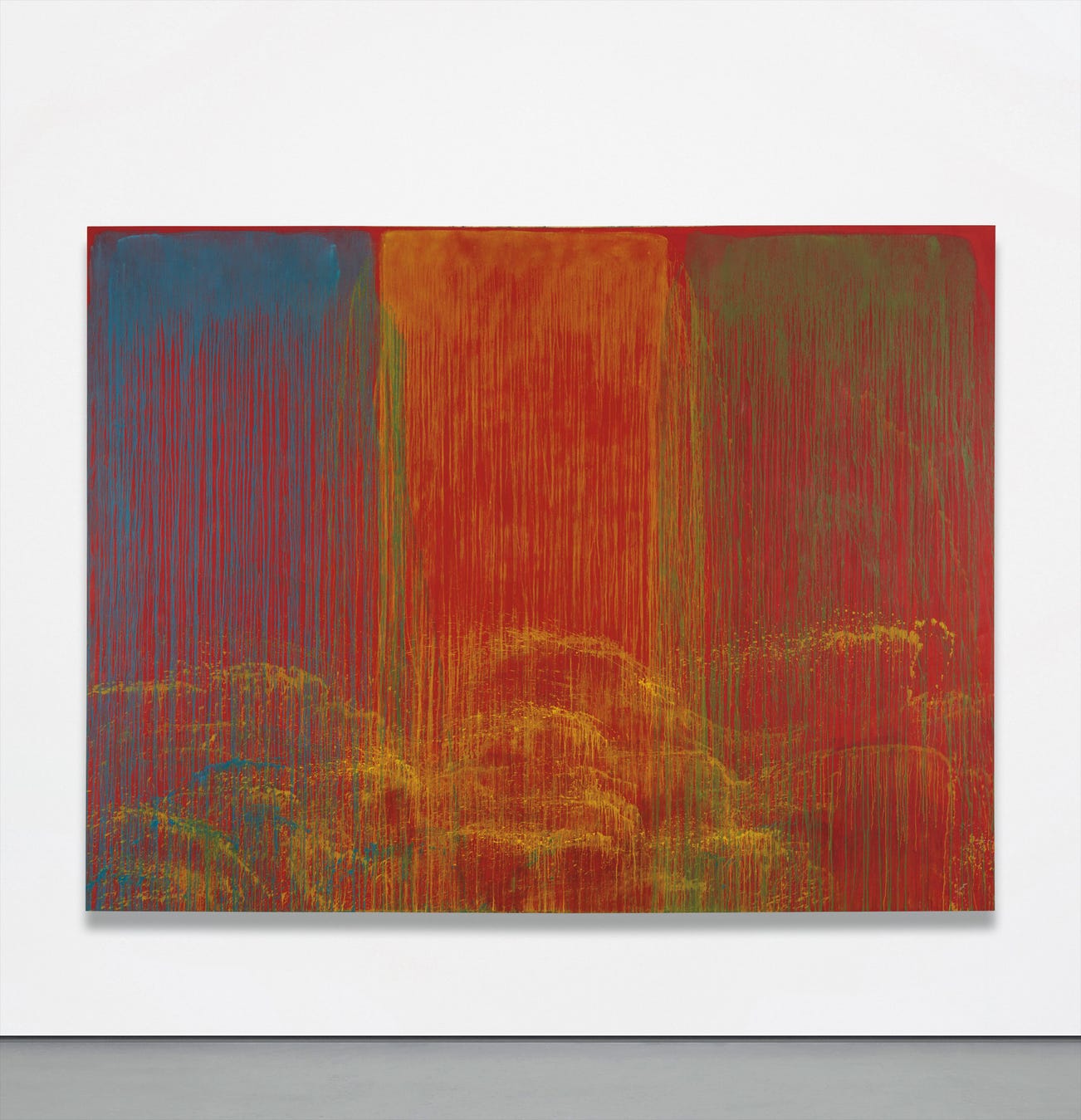 In Pat Steir’s Elective Affinity Waterfall, rivulets of blue and yellow paint cascade, flick and splatter across the vast expanse of the red canvas. Painted in 1992, just a year before the artist's participation in the 45th Venice Biennale, this work is one of the largest of Steir's extraordinary waterfall paintings from the late 1980s and 1990s that garnered her widespread critical acclaim. Titled Elective Affinity Waterfall in reference to J.W. Goethe’s eponymous novel and his theory of color more generally, it is among the first waterfall paintings that saw Steir embrace the primary colors of red, yellow and blue after limiting herself to a monochrome palette in the four years prior. As with Yellow and Blue One-Stroke Waterfall, 1992, which resides in the collection of the Solomon R. Guggenheim Museum, New York, this painting celebrates the expressive power of color - its visceral impact palpable as it captivates the viewer with a similar sense of the sublime when experiencing an epic waterfall in nature.