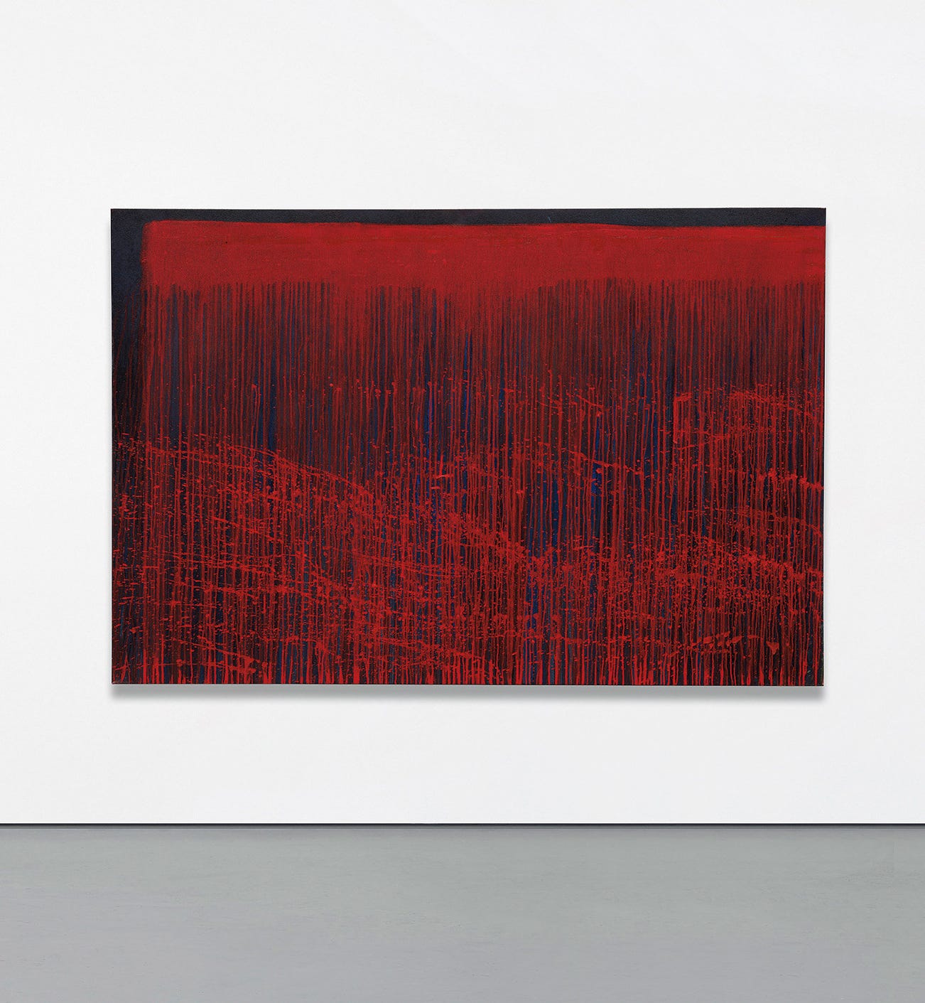 Executed in 1993, Top of Niagara Daylight Waterfall is an expressive tour-de-force hailing from Pat Steir’s most renowned body of work, the waterfall paintings. Profoundly influenced by the Chinese Yi-pin painters of the eighth and ninth centuries and Taoist philosophy, Steir began this meditative series in the late 1980s, in which she drips, splashes and pours paint onto an upright canvas, allowing action, gravity and chance to determine her final compositions. The effect is both mesmerizing and seductive. In Top of Niagara Daylight Waterfall, Steir captures the movement and dynamism of a waterfall as a tantalizing cascade of cherry-red drips down the deep blue canvas. Yet for Steir, the painting does not exist as a mere representation of a waterfall. Instead, the viewer, positioned in front of this all-encompassing composition, is overcome with a sense of awe, as though he or she is in fact standing at the top of Niagara Falls.