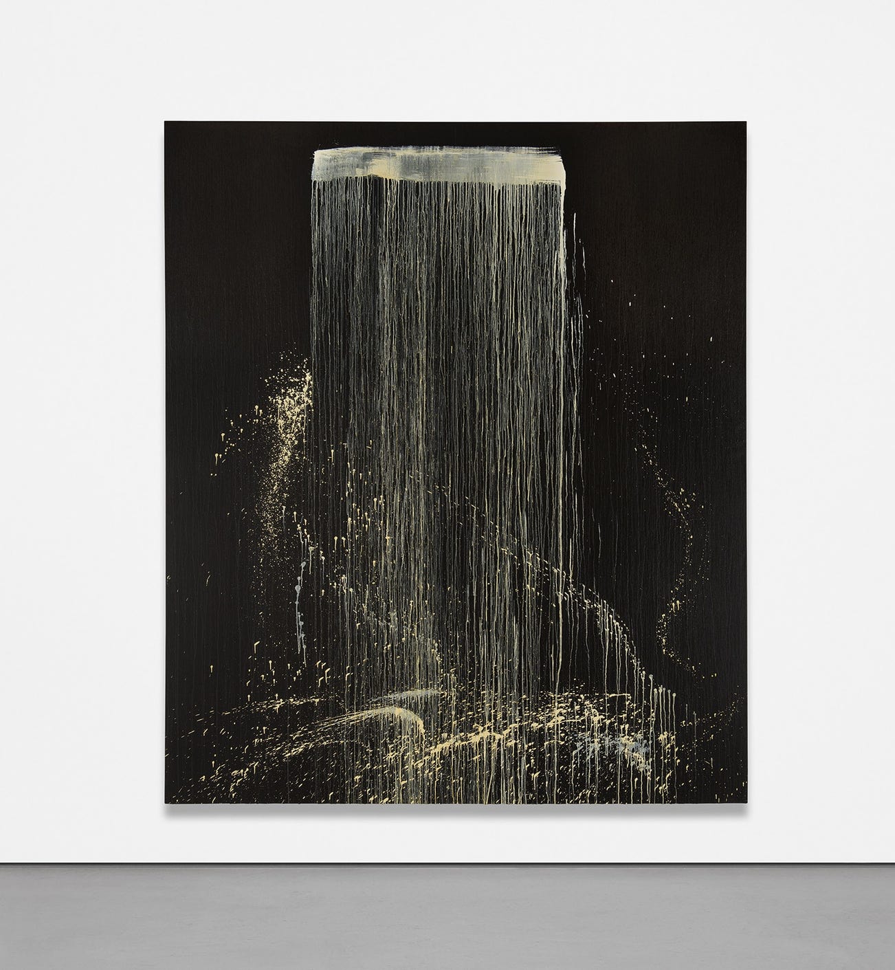 In the 1980s, struck by the radical ideas of the artist, composer and close friend John Cage on integrating “chance-controlled” elements into his watercolours, prints, drawings, and musical scores (most notoriously 4’33”) Steir’s working methods pivoted dramatically. Liberating herself from the confines of imagery, she began to produce dripped, splashed and poured paintings, allowing nature and elemental forces to take charge. Steir particularly drew inspiration from the Chinese Tang dynasty yipin (逸品) painters, who rebelled against orthodox painting methods in favour of explosive bursts of energy and spontaneity, splattering or using their hands to smear ink. Setting basic parameters about palette (from around 1989–92 this was increasingly limited to monochrome) and canvas shape, Steir would begin to throw, pour and stream oil pigments of various viscosities down the upright, primed linen canvas. With different speeds, drying rates and effects for each of the multiple, diaphanous layers, the final appearance of each work was subject to infinite variations: “My idea was not to touch the canvas, not to paint, but to pour the paint and let the paint itself make the picture.” (Steir, quoted in Phyllis Tuchman, ‘Gravity’s Rainbow: Hot on the Heels of Key Showcases, Painter Pat Steir Preps Major Washington, D.C. Exhibition’, ARTnews, 30 July 2019, online).