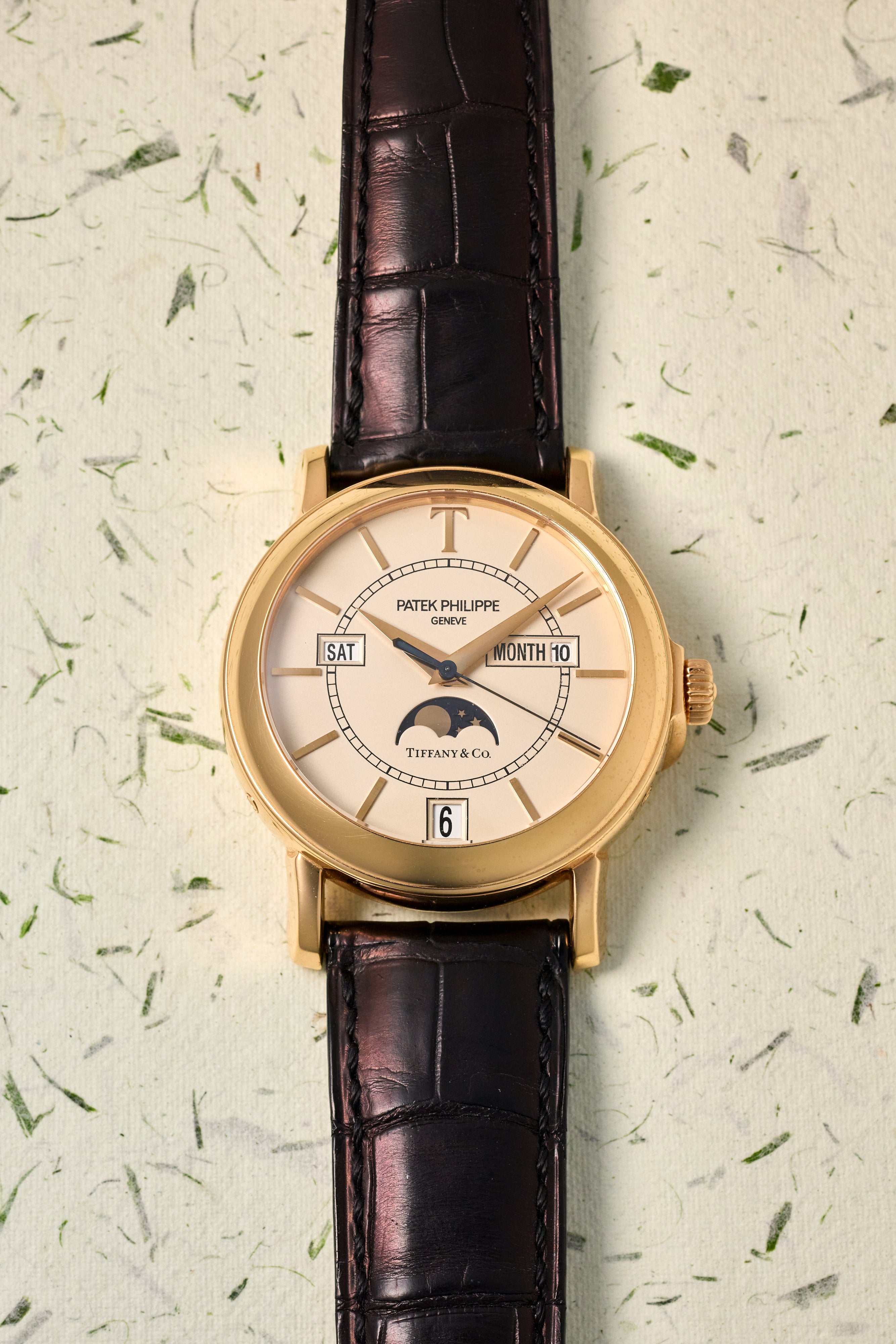 Accompanied by a Patek Philippe Certificate of Origin stamped Tiffany & Co., wooden fitted Patek Philippe presentation box, Patek Philippe and Tiffany & Co. pamphlet with commerative coin, numbered hang tags, suede Patek Philippe pouch, product literature, and Tiffany & Co. blue outer packaging