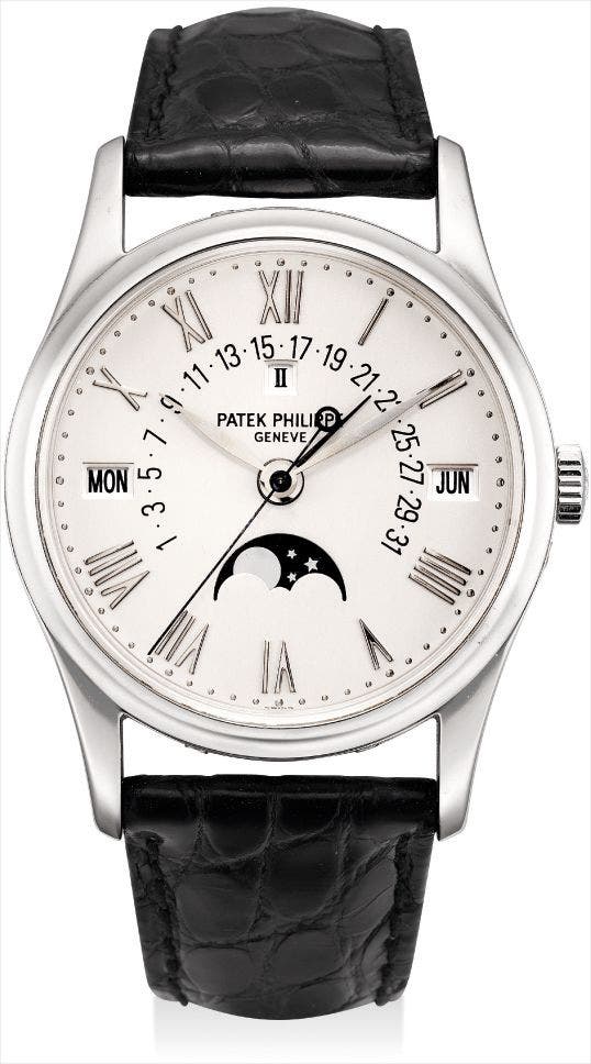 A fine and rare platinum perpetual calendar wristwatch with sweep centre seconds, retrograde date, moon phases, leap year indicator, Roman numerals, original certificate, additional case back and fitted presentation box