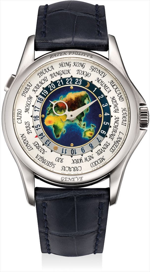 A very fine and rare white gold worldtime wristwatch with cloisonné enamel dial, original certificate and fitted presentation box