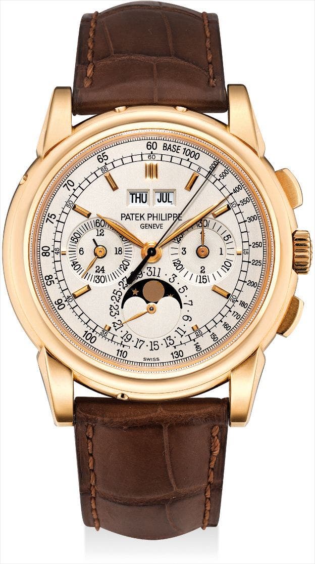 A fine and rare pink gold perpetual calendar chronograph wristwatch with moon phases, 24 hours, leap year indicator, additional case back, original certificate and fitted presentation box