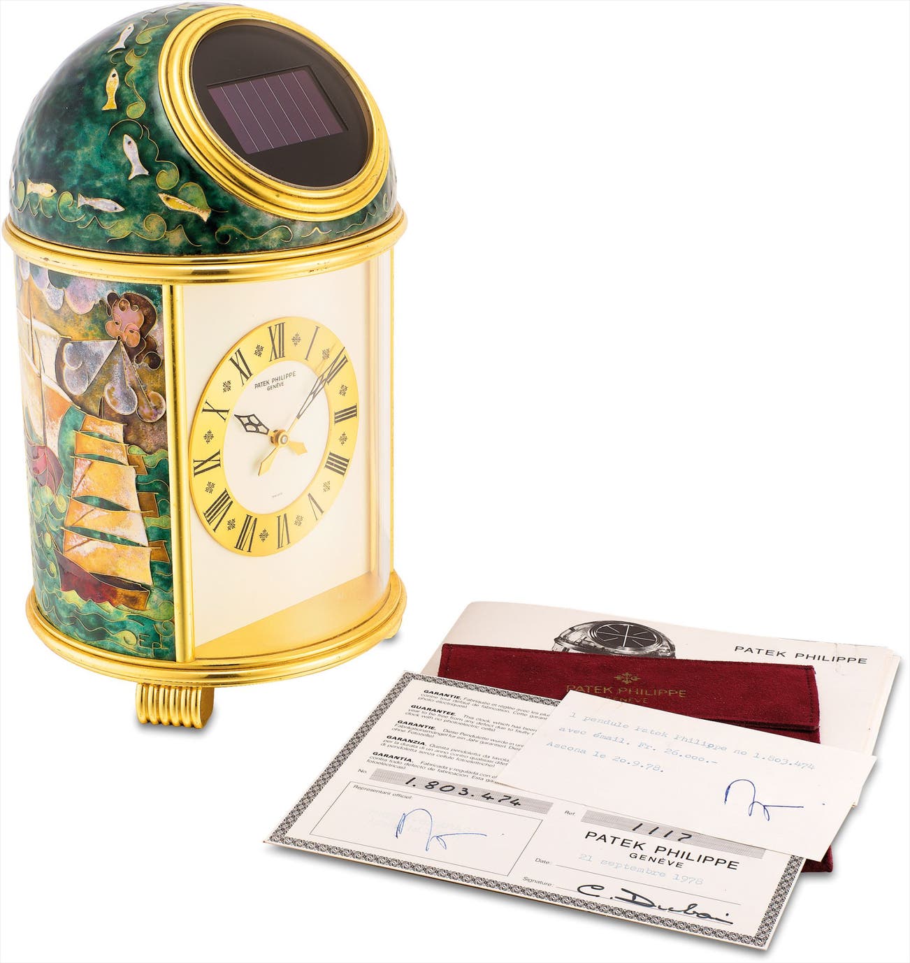 An extremely fine and unique gilt brass solar power dome table clock with cloisonné enamel by Elisabeth Perusset Lagger, original certificate and retail card