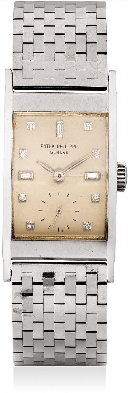 A rare platinum and diamond-set rectangular wristwatch with associated bracelet