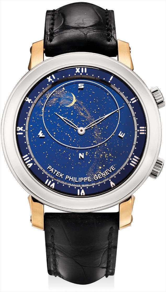 A fine and rare pink gold and platinum astronomical wristwatch with sky chart, phases and orbit of the moon and time of Meridian Passage of Sirius and of the Moon, original certificate and fitted presentation box