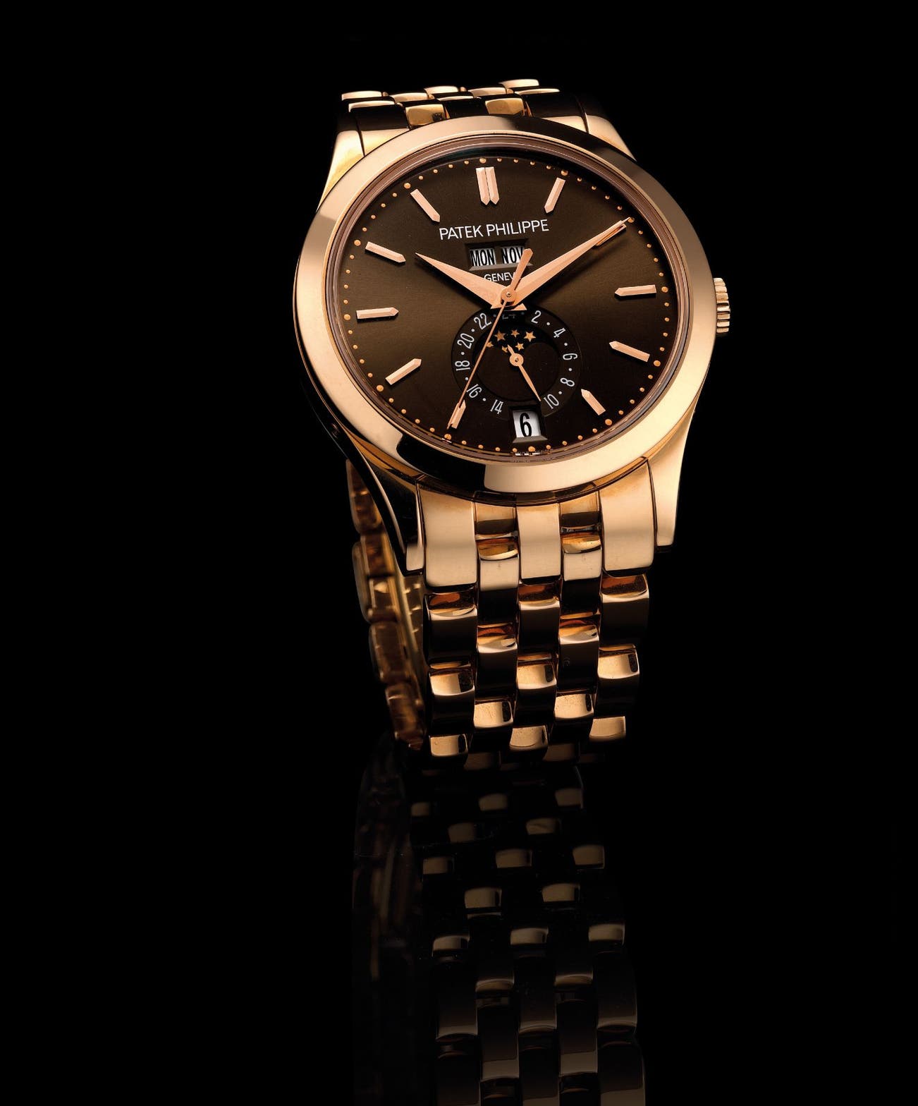 A fine and rare pink gold annual calendar wristwatch with sweep centre seconds, moon phases, 24 hours and bracelet