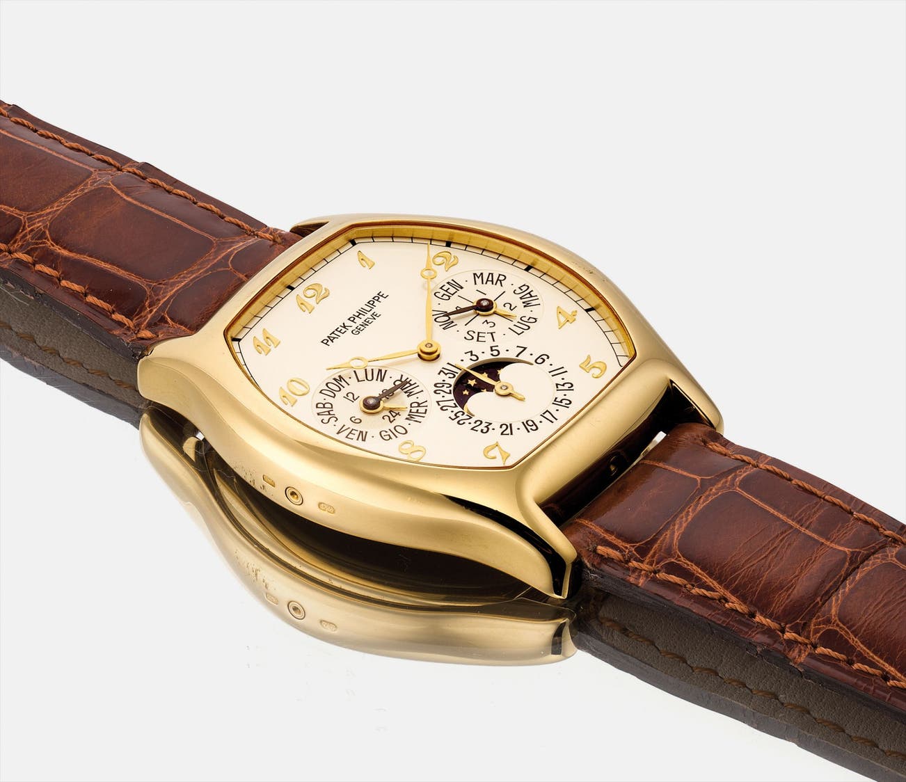 A fine and rare yellow gold tonneau-shaped perpetual calendar wristwatch with moon phases, 24 hours, leap year indicator and Breguet numerals