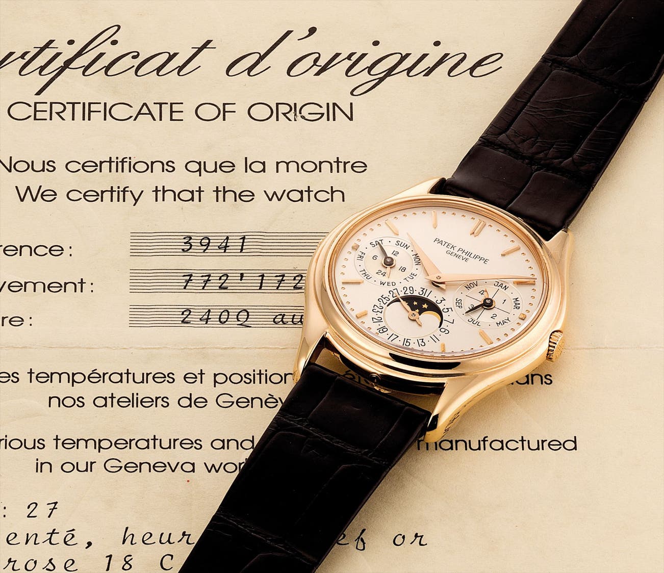 A fine and very rare pink gold perpetual calendar wristwatch with leap year indicator, moon phases, 24 hours and original certificate