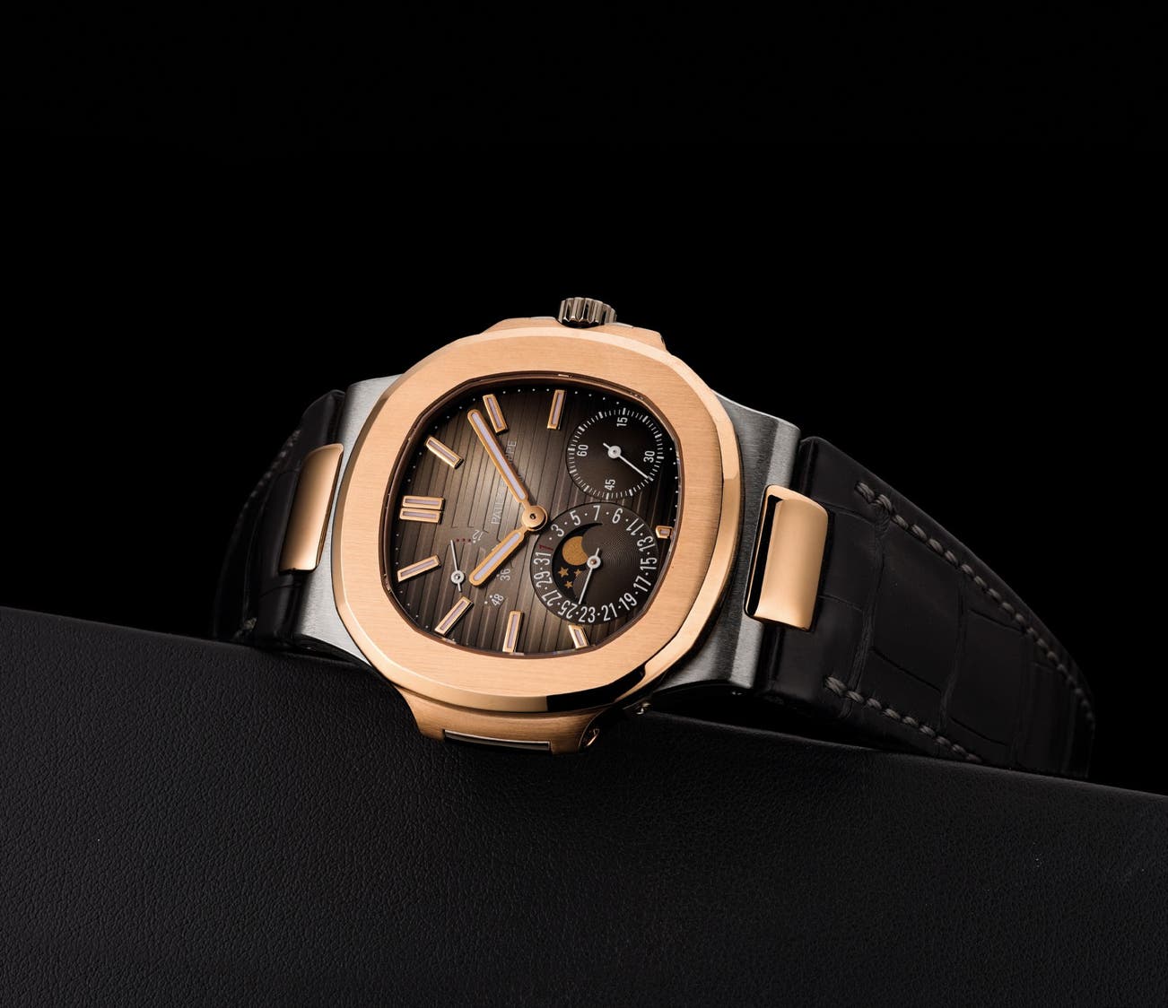 A fine and rare pink and white gold wristwatch with date, moon phases, power reserve, original certificate and fitted presentation box, made for the Hong Kong market