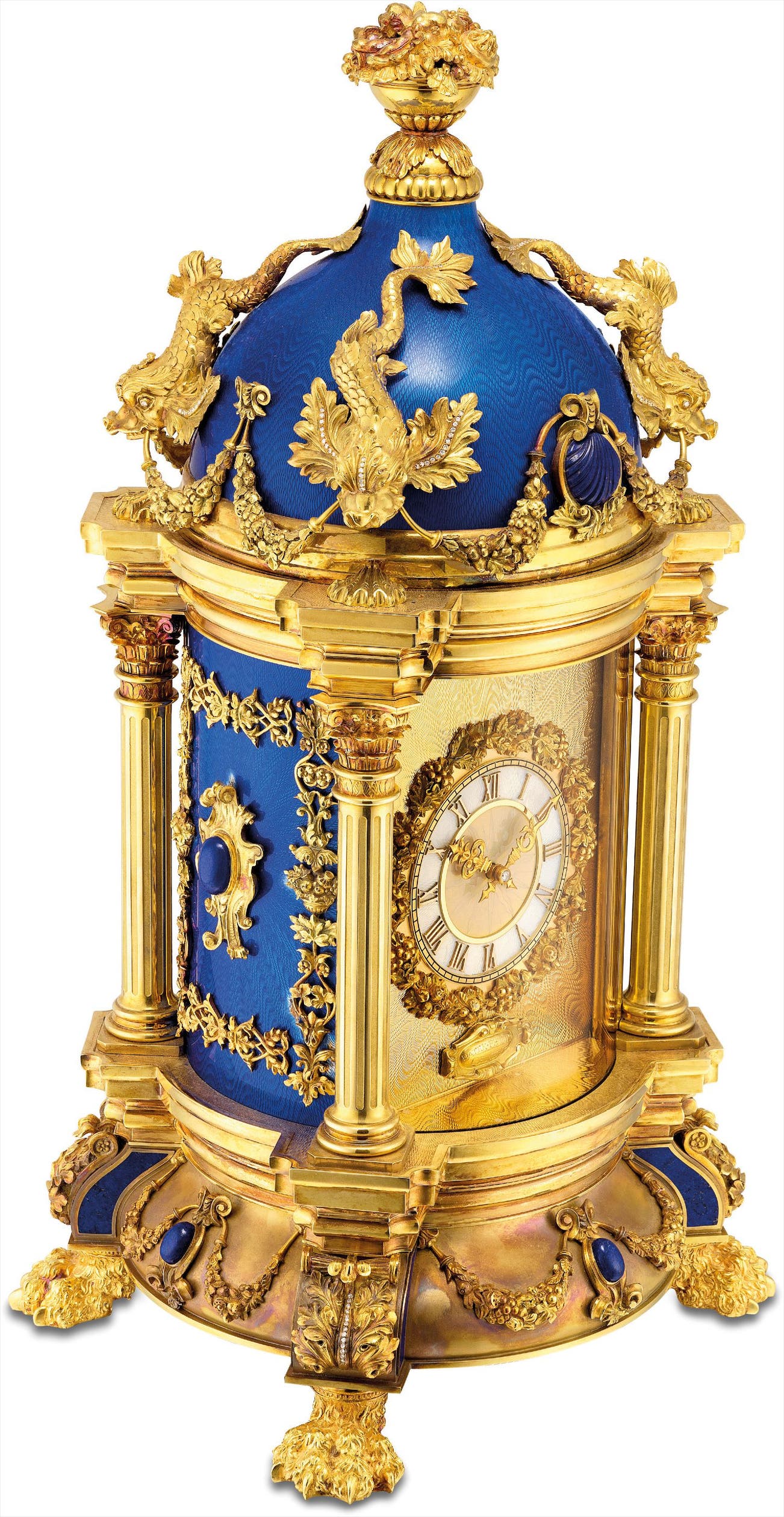 A magnificent, impressive and unique yellow gold, silver, diamond, lapis lazuli and translucent royal blue enamel museum quality baroque style dome clock with mother-of-pearl dial and original fitted presentation box