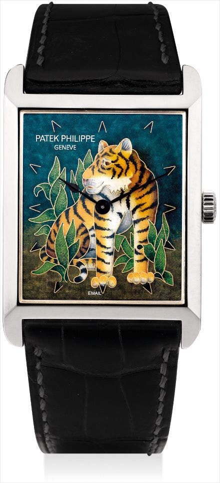 A very fine and unique platinum rectangular wristwatch with cloisonné enamel dial and original certificate