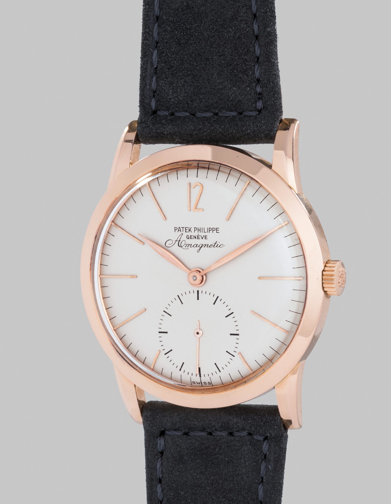 By definition, Amagnetic watches are tool watches, and consequently cased in stainless steel. Yet, Patek Philippe dared to case a very small number of Amagnetics in yellow gold and even fewer in pink gold. Only seven pink gold examples of the 2570/1 are known, amongst which only three have “Amagnetic” printed on the dial. This watch is furthermore the only one of the three that is accompanied by its original certificate, making the present lot even more appealing and covetable.