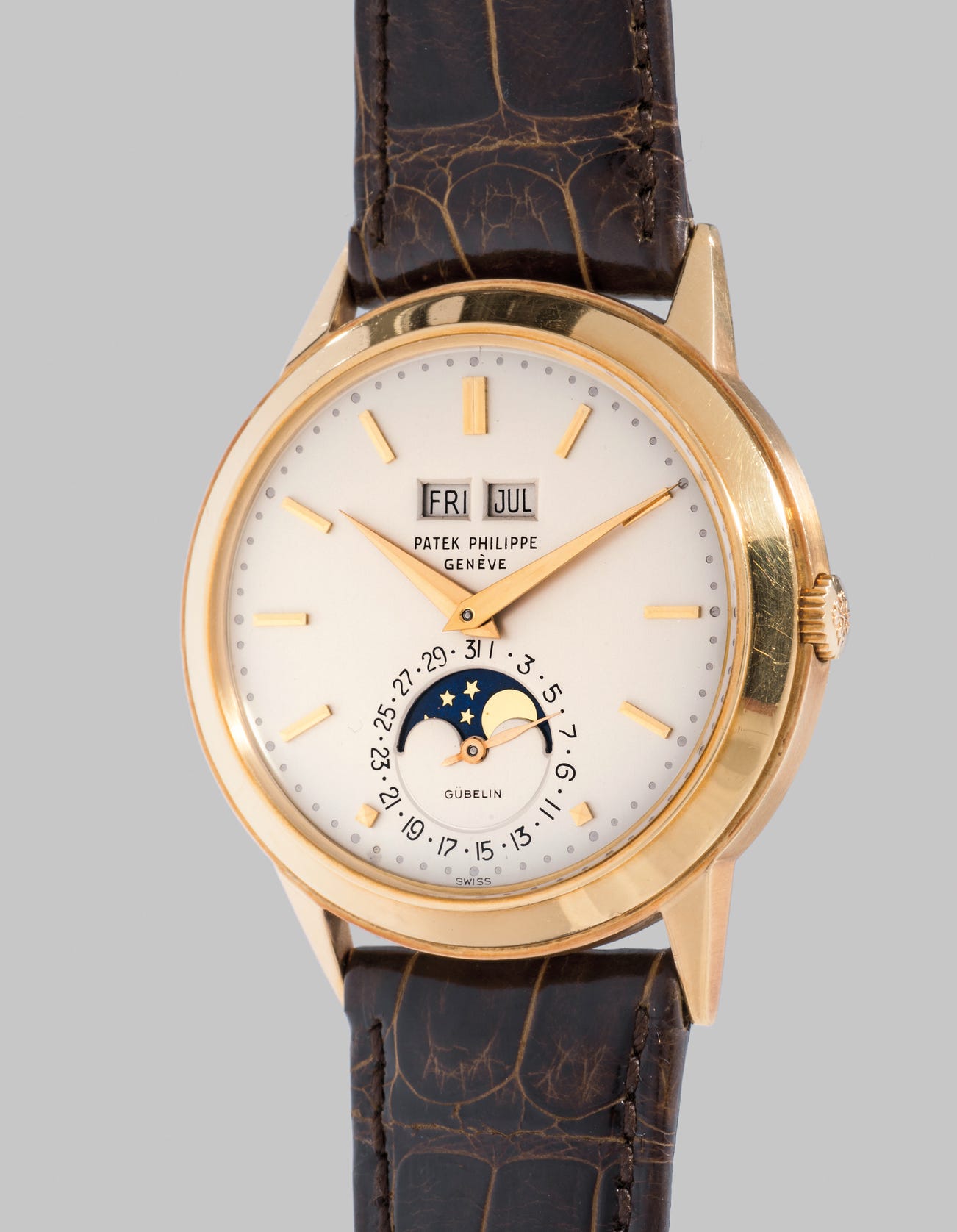 The rarity and desirability of this milestone piece is further enhanced by the Gübelin signature beneath the moonphase indicator. Founded in Lucerne in 1854, Gübelin was then as now, one of the most exclusive retailers of fine horology.