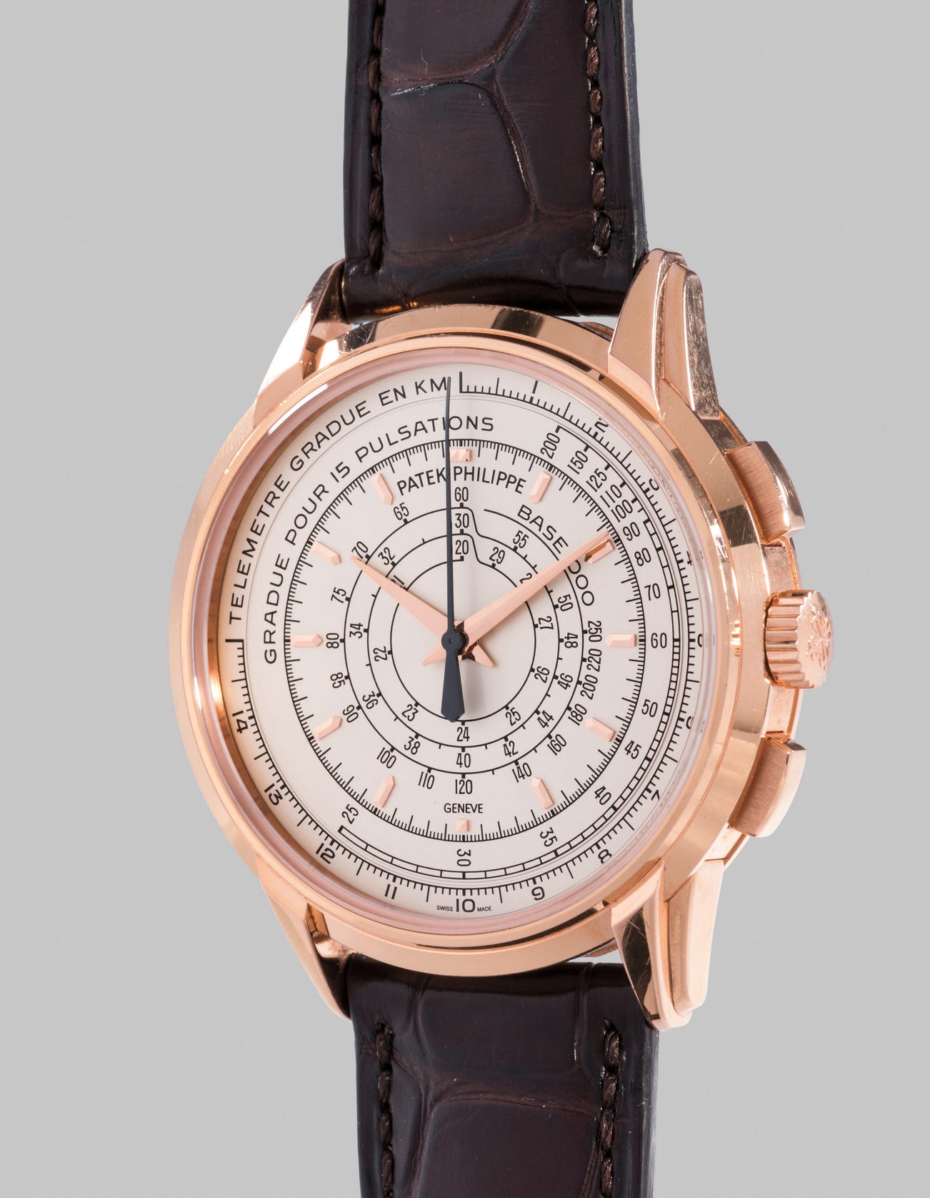 The dial of reference 5975 is a tribute to Patek Philippe's chronographs of the 1940s and 1950s, featuring a lovely three scale indication with a telemeter on the outermost scale for the calculation of distances, a pulsometer graduated for 15 pulsations for the calculation of heartbeats, and a tachymeter for the computation of speed. Surprisingly the watch can be mistaken for a simple three handed watch as Patek Philippe decided to forego the habitual chronograph subdials.