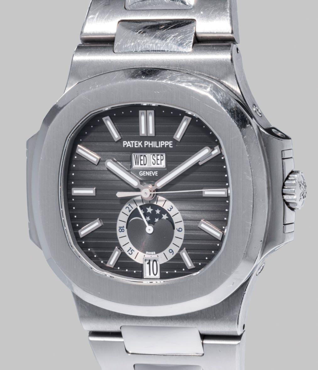 Even though the present lot is still in production it is extremely rare to find one on the secondary market. In fact, it is only the third time the Patek Philippe Nautilus Ref 5726/1A has appeared on the international auction market. The present watch is offered in very good overall condition, with its original box, accessories and extra links.