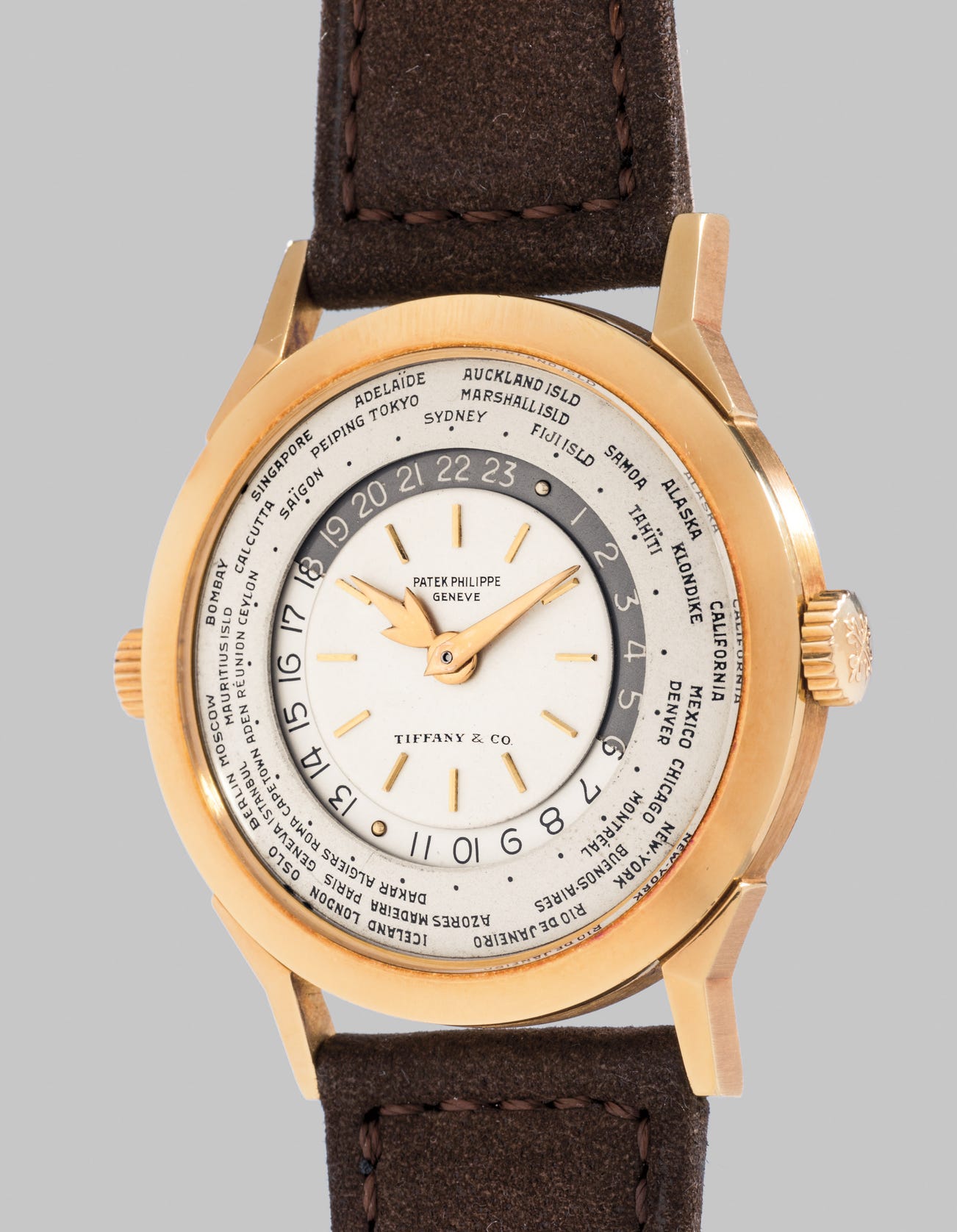 An extremely rare, important and attractive 18K gold dual crown world time wristwatch with 24 hour indication, retailed by Tiffany & Co.