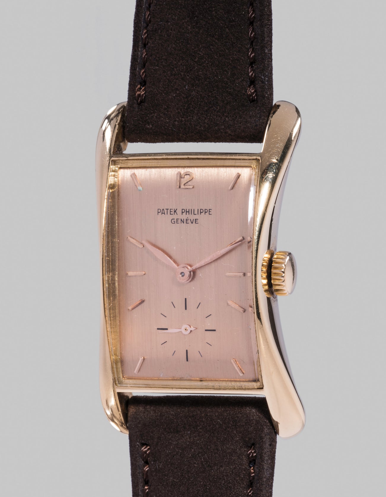 Reference 2442 most notably features curved and flared lugs, its 42.5 millimeter case sits incredibly well and gives a lot of presence on the wrist. The reference was cased mostly in yellow gold, like the present watch. It was also manufactured in pink gold and platinum. According to research, only 49 yellow gold examples have appeared on the market thus far, and this is the second known yellow gold example with a pink dial.