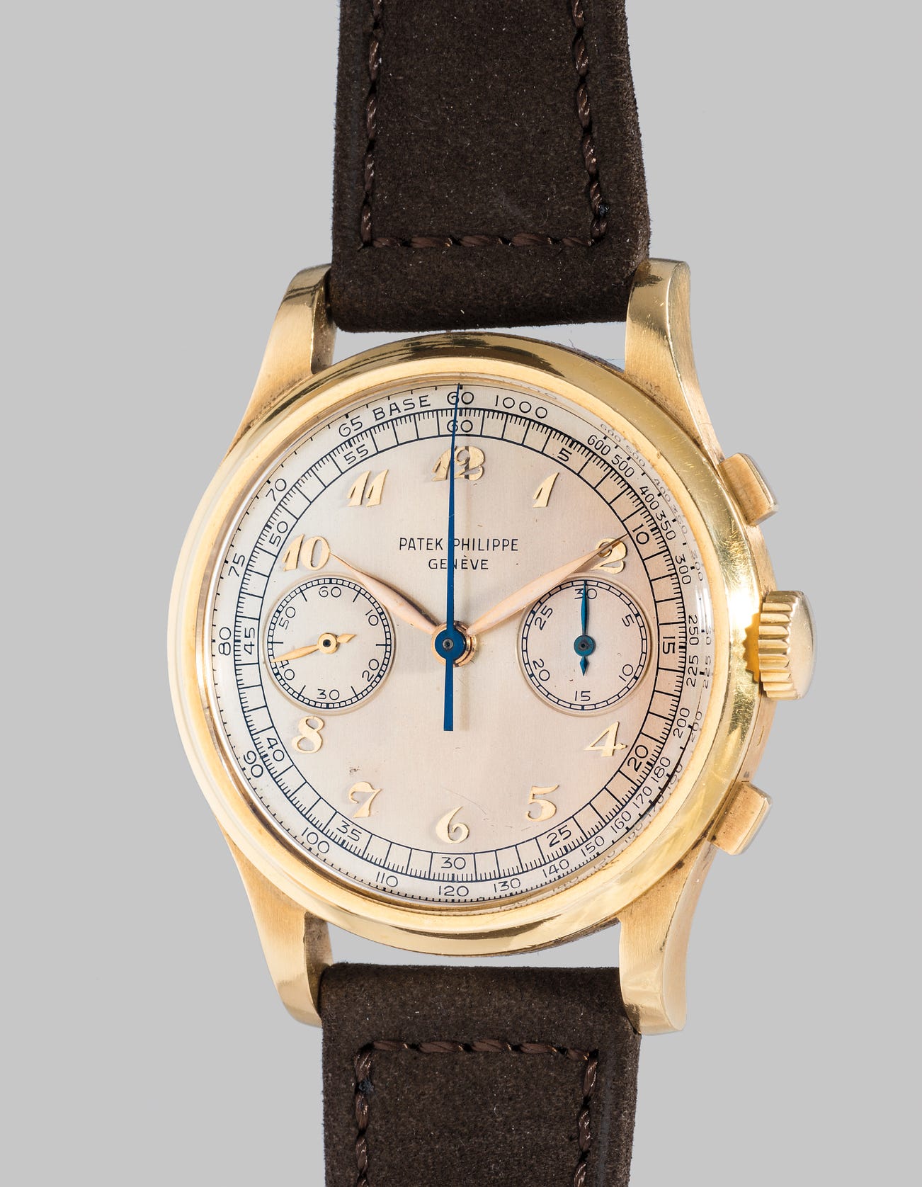 The only known, large and very attractive yellow gold chronograph wristwatch with silver dial and Breguet numerals