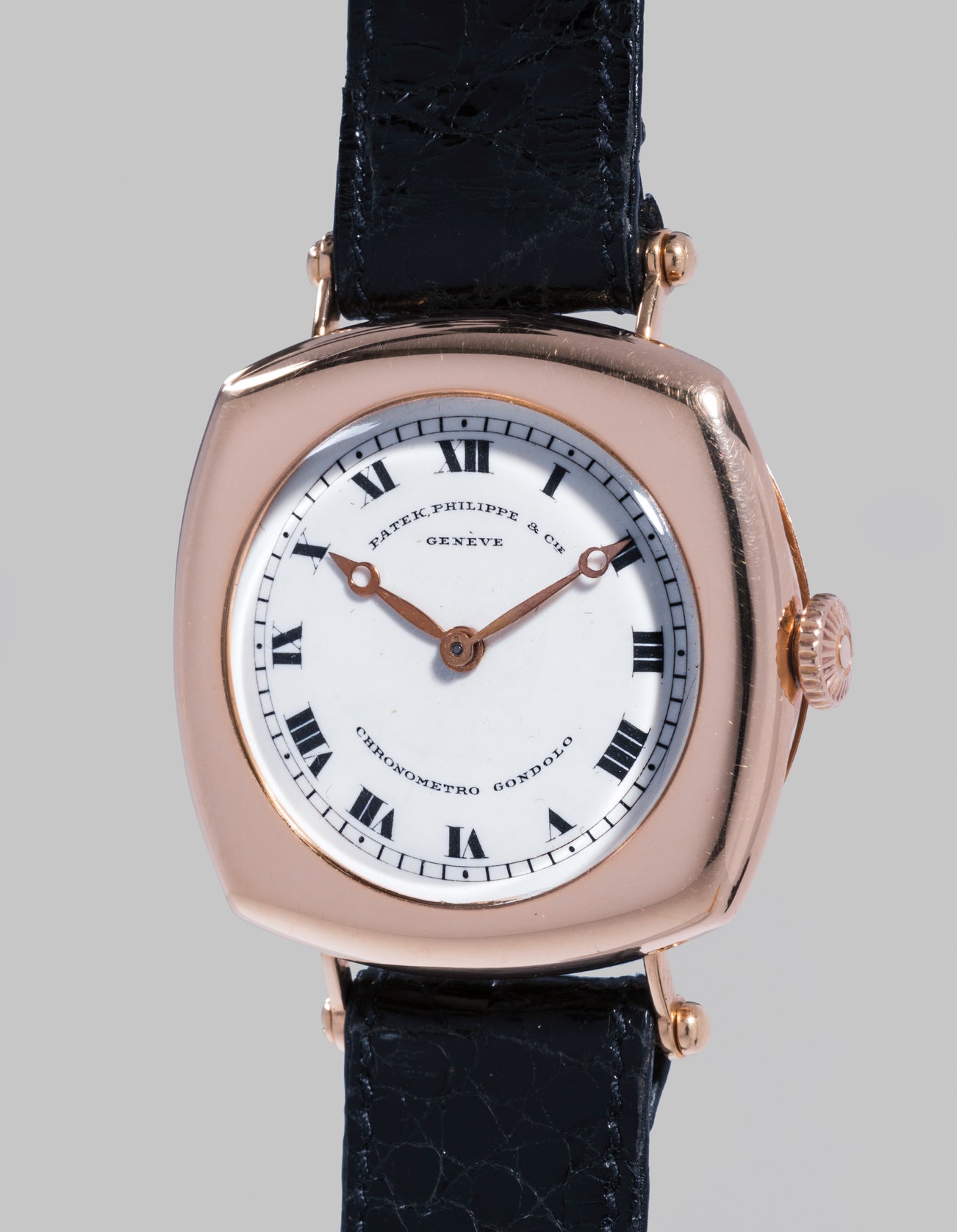 Production of Chronometro Gondolo wristwatches began in 1910 for Gondolo & Labouriau. Patek Philippe produced these wristwatches in a variety of sizes and case shapes, from circular and square to cushion-shaped and rectangular. However, all were equipped with movements of the highest finish, meeting the exact requirements set by the Brazilian firm: wheel train made in 9 karat gold, cam-wheel regulator, moustache lever and wolf's tooth winding gears.