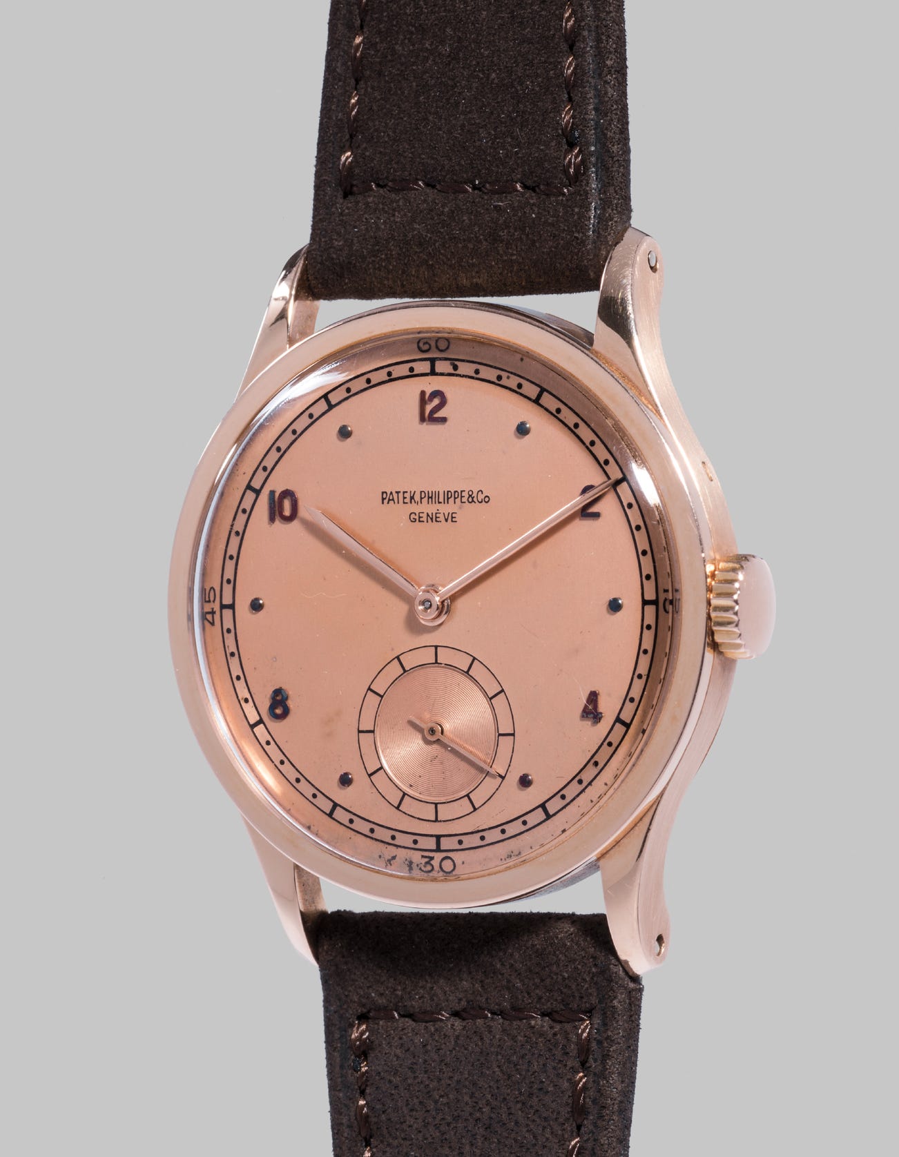 A version in pink gold with two tone pink dial, like the present lot, provides a sense of exhilaration and excitement for collectors not only for its ultimate rarity but also for its achingly dashing looks.
