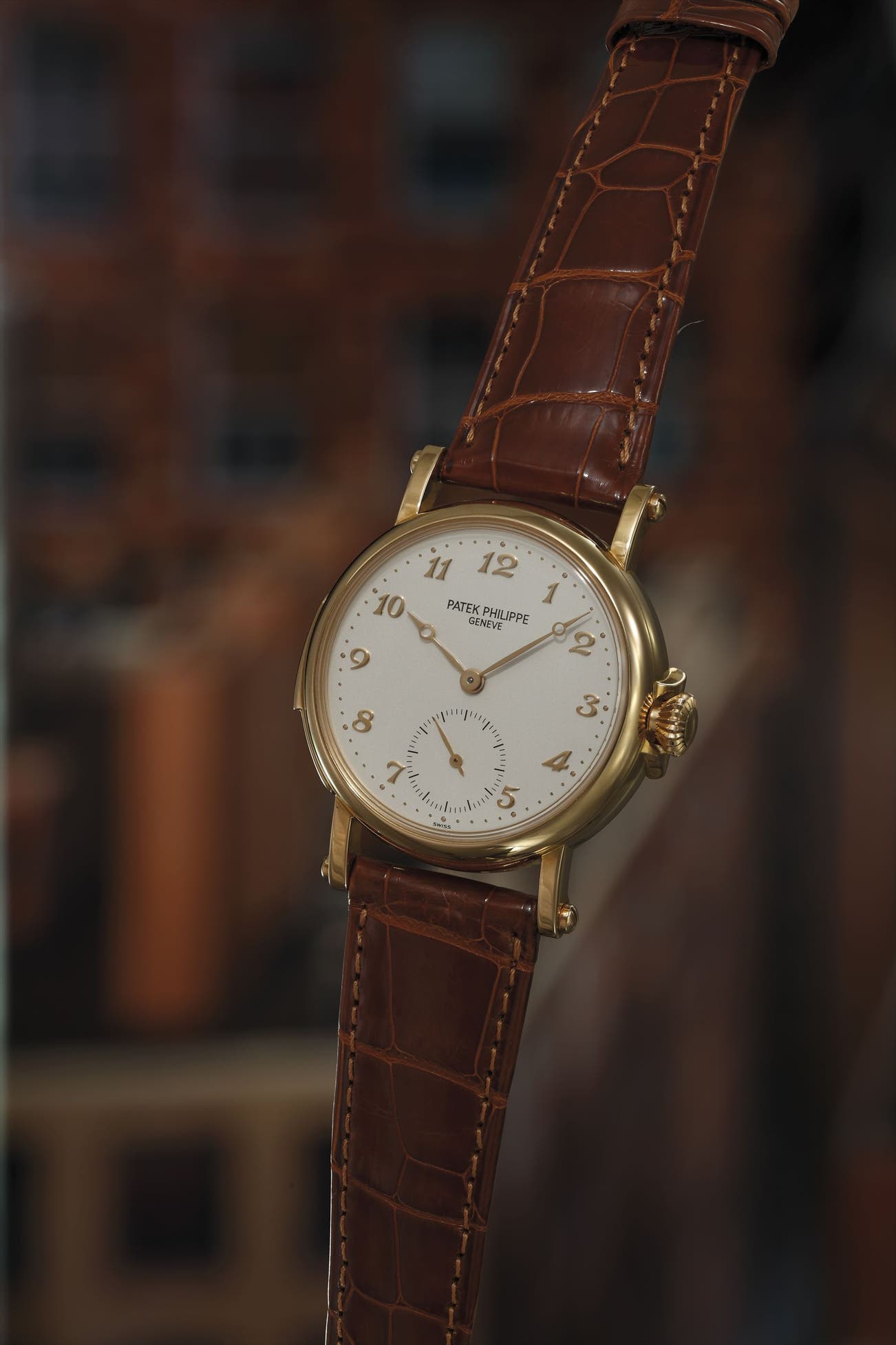 Manufactured in a limited series of only 10 examples in yellow gold, pink gold and platinum, resulting in only 30 timepieces total. This minute repeating watch combines everything the market has come to admire about arguably the greatest watch manufacture in history. Its understated looks will fool the casual observer, who would have no idea the watch is fitted with an ingenious, ultra-thin minute repeating movement, the caliber R 27 PS, incorporating an offset winding rotor that permits space for the two minute repeating gongs. The beautiful officer-style hinged case with screw-set lugs is a recognizable design synonymous with some of Patek Philippe’s most beautiful dress watches. Actuate the discreet slide at 9 o’clock, and the clear, crisp, and surprisingly loud chimes that strike the exact time will absolutely delight its subject. The present 5029R timepiece is perfectly preserved, as if it had never been worn since the time of sale. It is as complete as one could hope for, with its presentation boxes, original certificate of origin, Attestation, Controle Officiel Suisse des Chronometre, leather pouch, product literature, and hangtag. Furthermore, the watch is offered with an Extract from the Archives confirming date of production in 1997 and subsequent sale date on February 27th, 1998. For the discerning collector, it is an exquisite trophy watch worthy of crowning the world’s finest collections.