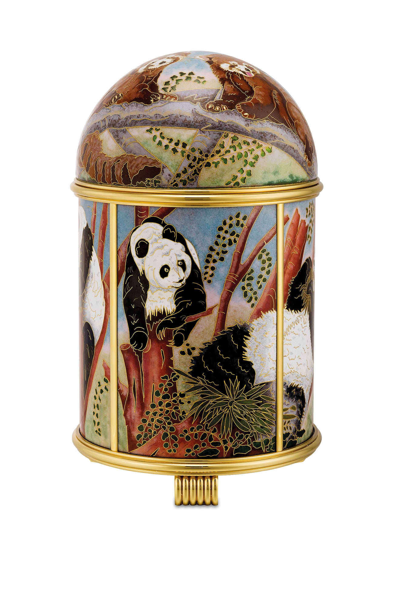 In exceptional condition, the cloisonné enamel is free from restoration and defects and is a fine example of the quality and expertise required to make such a work of art. The enamel work is signed “FTille” for “France Tille” who has been involved in watchmaking since 1976. As a child, she was interested in drawing, and studied applied arts, ultimately setting up her own workshop. Today, she has exhibited works in Europe and her skill and technique vividly articulates the panda’s expression.