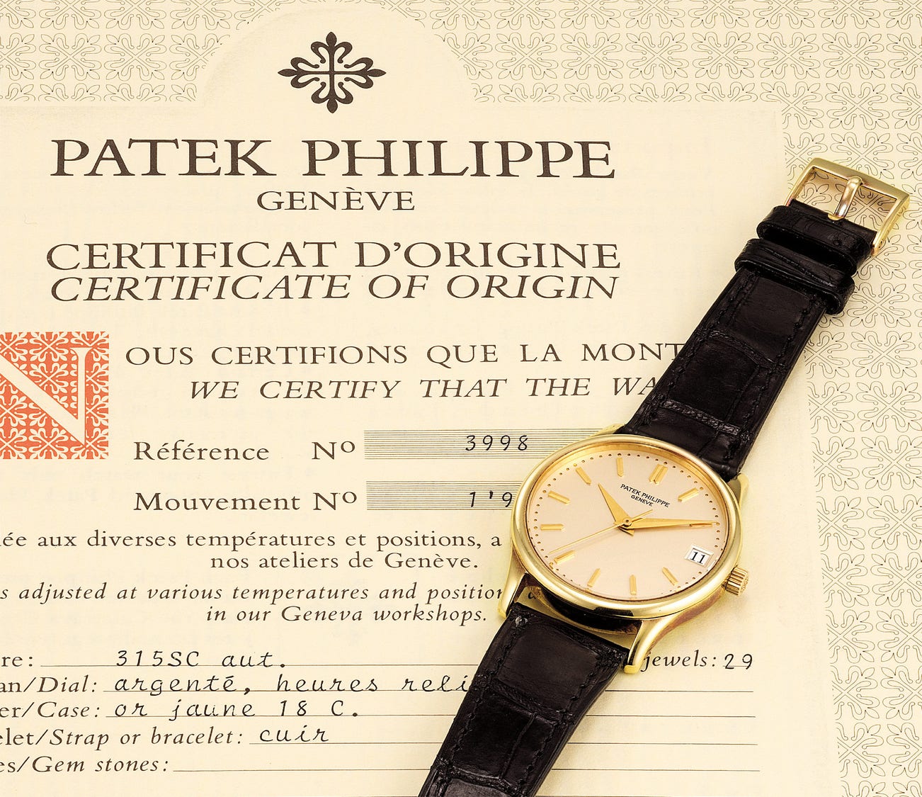 An attractive yellow gold wristwatch with date, center seconds and the certificate of origin