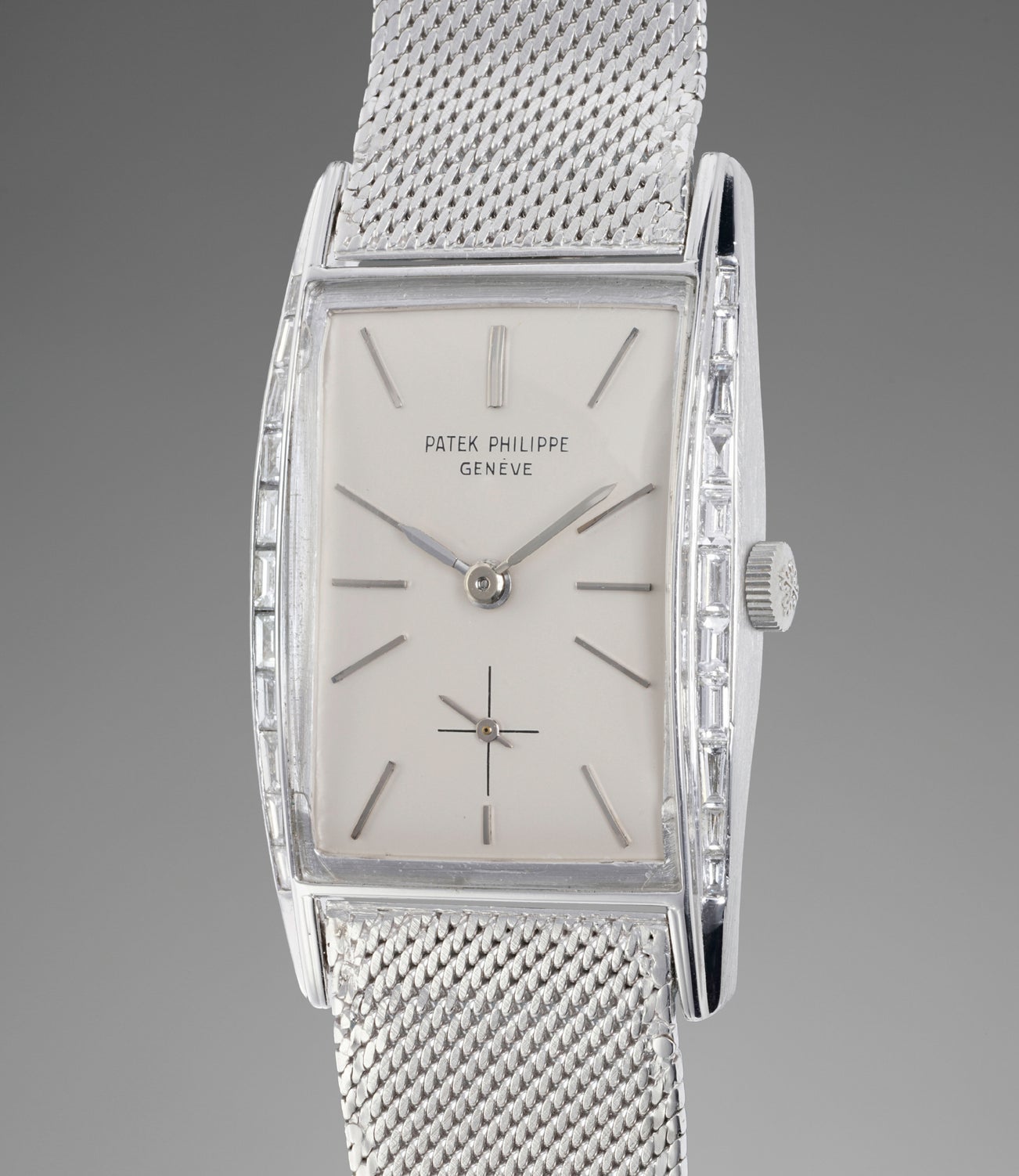 An exceedingly rare reference in any metal, it’s especially rare in platinum with matching and correct platinum bracelet, and its rarity is elevated to a different level thanks to the baguette diamonds gracing the case, of which only 4 models are known to date. The tapered baguette diamonds set inside the flared sides of the case is highly unusual, and illustrates incredible craftsmanship.