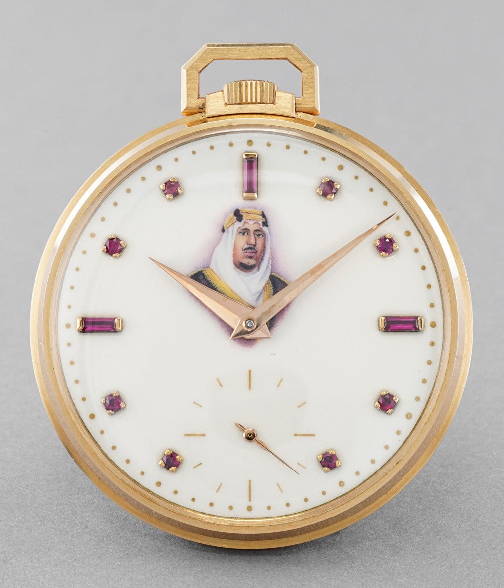 In 1953, Patek Philippe's retailer in Saudi Arabia - Red Sea Trading - placed an order which expands and improves on this concept: Patek Philippe was asked to produce a series of pocket watches ref. 600/1 and wristwatches ref. 2481 bearing a special enamel dial with ruby indexes and featuring the portrait of King Saud bin Abdulaziz Al Saud of Saudi Arabia in commemoration of his accession to the throne in 1953. The watches were delivered over the course of the following years.