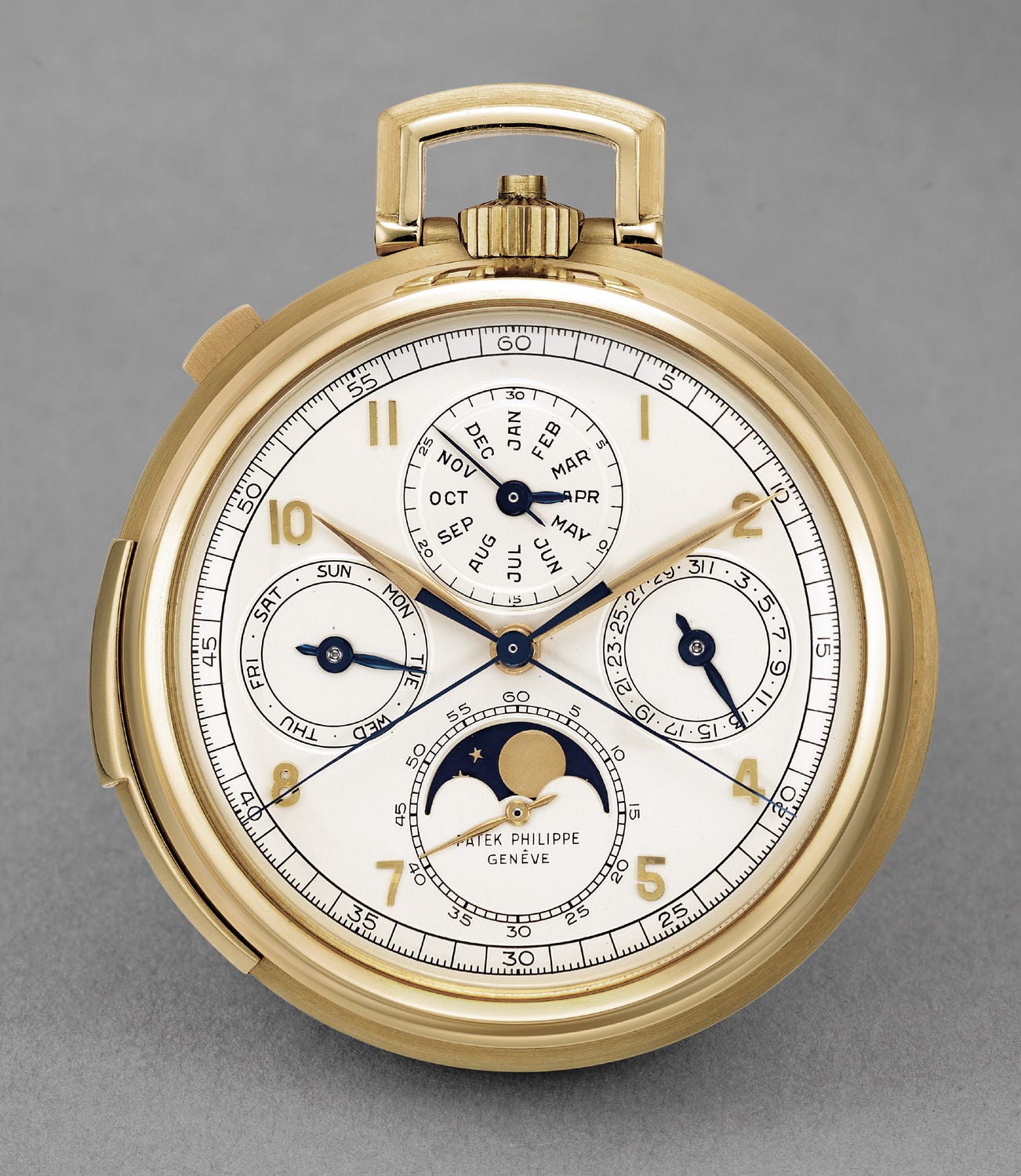 A highly rare and attractive yellow gold minute repeating perpetual calendar openface pocketwatch with split seconds chronograph and moonphases