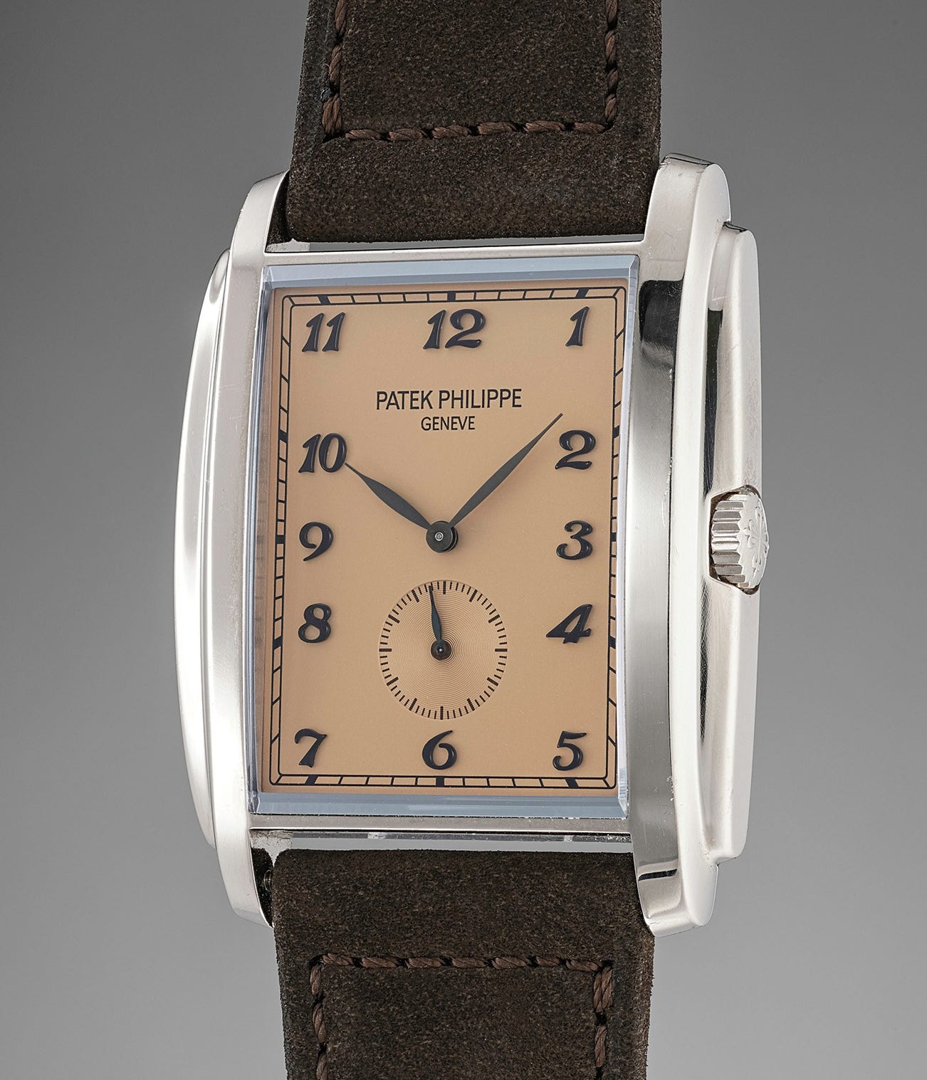 A superbly versatile watch, the present reference 5124 is incredibly appealing thanks to its graphic aesthetics, rectangular art deco stepped case, salmon dial, Breguet numerals and feuille hands. This watch has a devoted following among dandy collecting circles.