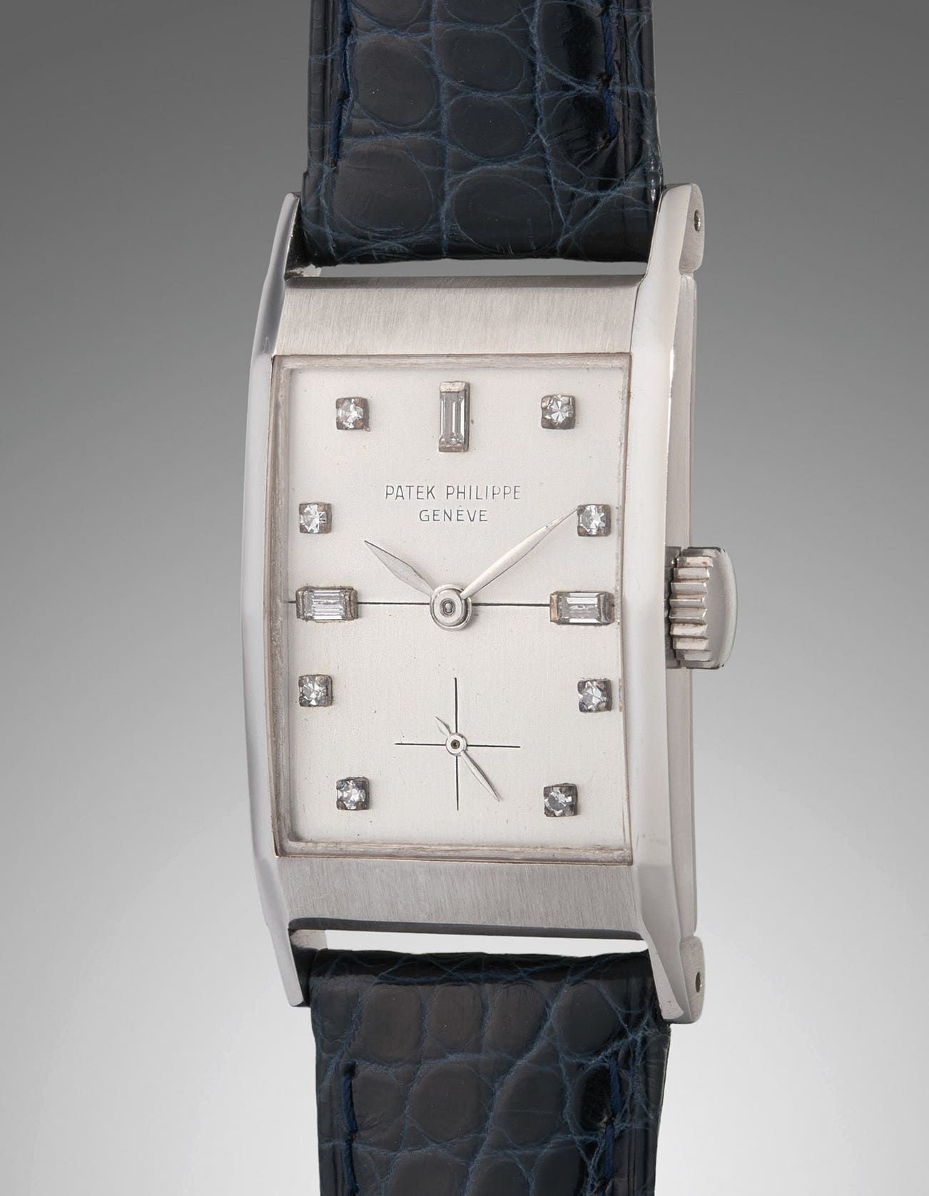 A rare and attractive platinum and diamond-set rectangular-shaped wristwatch