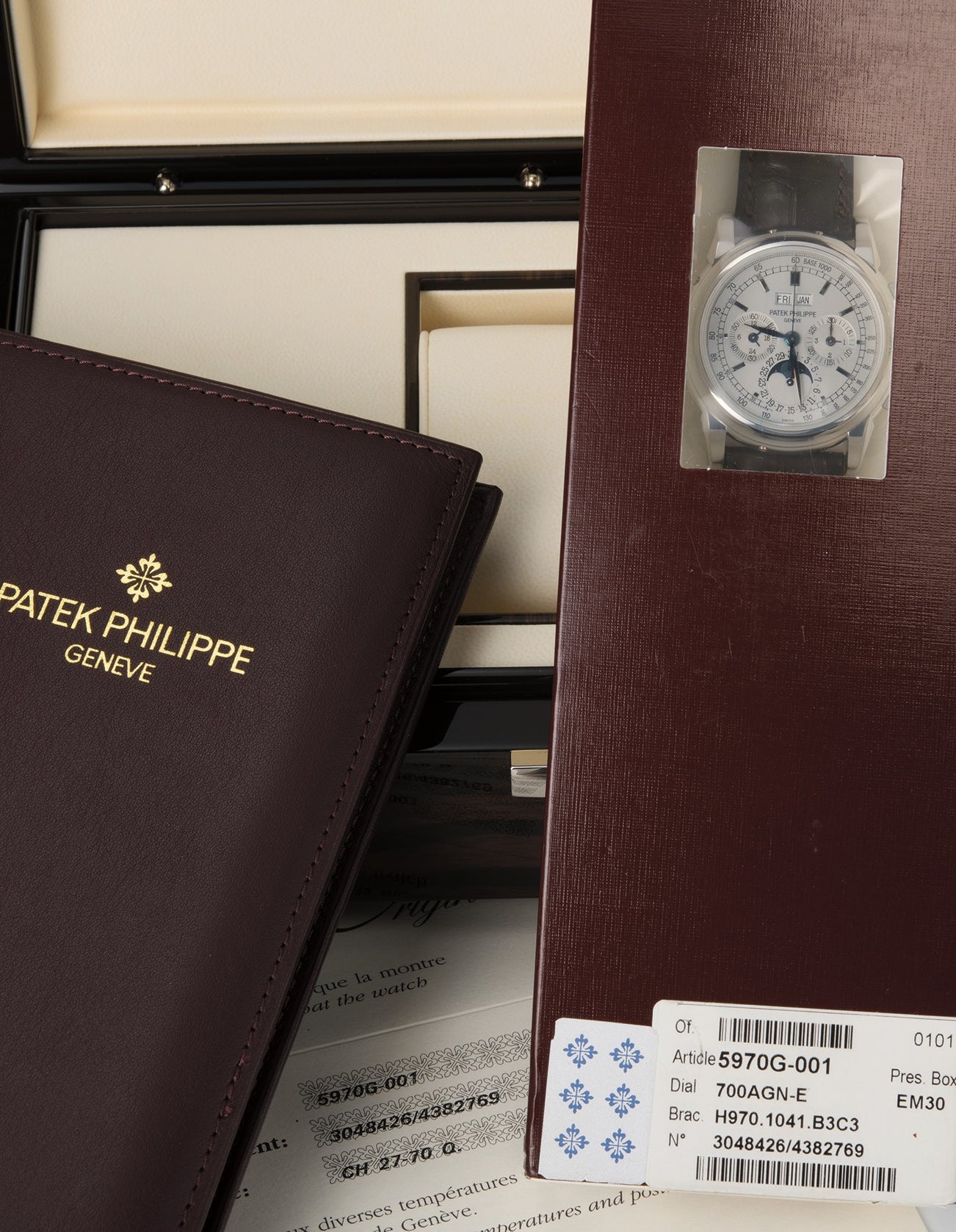 A fine and rare white gold perpetual calendar chronograph wristwatch with moon phase, certificate of origin and fitted presentation box, factory double sealed